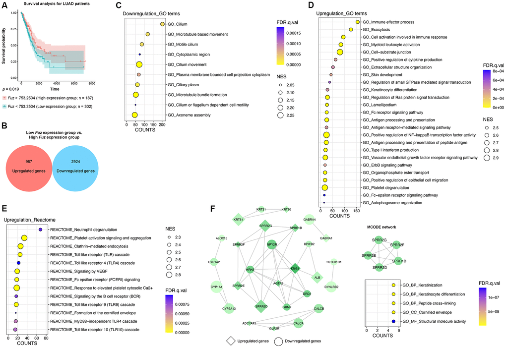 Similar to HNSC tumor samples (Figure 3A), we divided all LUAD primary tumor tissues with available patient survival information (n = 489) into high Fuz expression group (n = 187) and low Fuz expression group (n = 302). Poor OS in LUAD patients was observed in low Fuz expression group (Figure 4A). We then performed differential gene expression analysis between low and high Fuz expression groups (Supplementary File 1). The log2FC and adjusted p < 0.001 were used to select upregulated (987 genes) and downregulated (2,924 genes) gene sets in the low Fuz expression group (Figure 4B). The ranked gene set was submitted to GSEAPreranked for the subsequent enrichment analysis. Similar to what was observed in HNSC samples, more GO terms were enriched in upregulated gene set (25 items) compared to the downregulated one (10 items) (Figure 4C, 4D). The Reactome pathway analysis identified 13 enriched upregulated pathways (Figure 4E). The top 500 dysregulated genes were selected based on the |log2FC| for the following PPI network construction. The obtained PPI network from STRING database was visualized in Cytoscape software. The isolated MCODE network is composed of small proline-rich protein 1B (SPRR1B), small proline-rich protein 2D (SPRR2D), small proline-rich protein 2E (SPRR2E), small proline-rich protein 2F (SPRR2F) and small proline-rich protein 2G (SPRR2G), which are involved in Keratinization and Peptide cross-linking (Figure 4F).