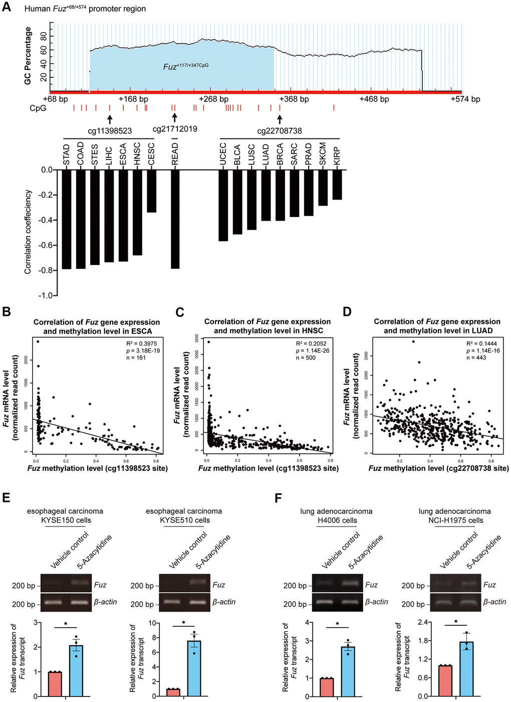 DNA methylation is one of the essential epigenetic regulators of gene expression [25]. Given that DNA methylation in gene promoter negatively controls gene transcription, we investigated whether the aberrant Fuz transcription is associated with alteration of Fuz promoter methylation in different types of cancer (Supplementary File 2). As shown in Figure 5A, 3 independent CpG methylation sites, cg11398523, cg21712019 and cg22708738, were identified within or close to a predicted CpG island in the Fuz promoter (Fuz+117/+347CpG) [23]. The DNA methylation levels at sites cg11398523 and cg22708738 were found negatively associated with Fuz expression in multiple types of cancer, including ESCA, HNSC and LUAD (Figure 5A). The mRNA expression and DNA methylation data obtained from TCGA further confirmed an inverse correlation between Fuz expression and its DNA methylation level in ESCA, HNSC and LUAD primary tumor tissues (Figure 5B–5D). Moreover, upon treatment of 5-Azacytidine, inhibitor of DNA methyltransferase, Fuz expression was upregulated in cell lines from esophageal carcinoma (Figure 5E) and lung adenocarcinoma (Figure 5F).