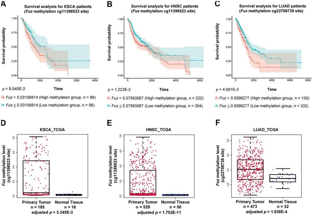 We found that high Fuz DNA methylation at site cg11398523 and cg22708738 leads to reduced survival probabilities in HNSC and LUAD patients, respectively (Figure 6B, 6C). These coincide with our findings that lowered Fuz expression contributes to poor OS in HNSC and LUAD patients (Figures 3A, 4A). Meanwhile, lowered expression of Fuz was found associated with poor OS in ESCA patients (Supplementary Figure 4). Although a tendency of high Fuz DNA methylation level at site cg11398523 was observed in ESCA patients with poor OS, the difference in survival probabilities between high and low Fuz DNA methylation groups was not statistically significant (Figure 6A). We further compared Fuz DNA methylation levels between ESCA, HNSC and LUAD primary tumor tissues and their respective normal controls. As shown in Figure 6D–6F, a significant upregulation of Fuz DNA methylation level was detected in ESCA, HNSC and LUAD tumor samples. Taken together, these findings demonstrate a negative correlation between Fuz mRNA expression and Fuz DNA methylation level, and further suggest that Fuz promoter hypermethylation is a contributor to its transcriptional downregulation in ESCA, HNSC and LUAD.