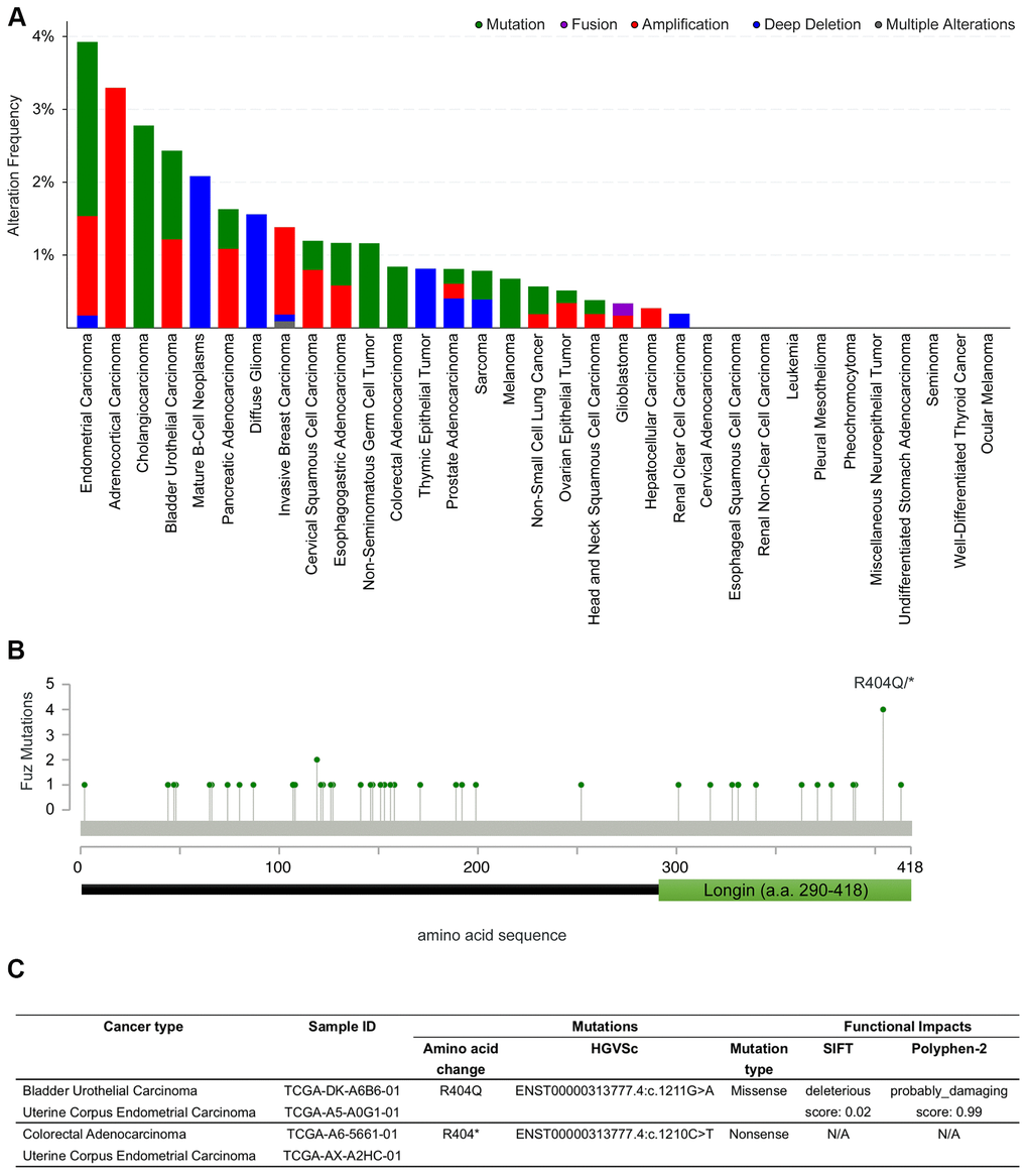 We thus explored if potential coding region variations in the Fuz gene exist in cancer genomes. The alteration frequency of Fuz was examined across 32 independent TCGA PanCancer Atlas Studies using the cBioPortal database (https://www.cbioportal.org/). Several kinds of genetic alterations, including mutation, fusion, amplification and deep deletion in the Fuz gene were uncovered from various cancer types, with the highest alteration frequency found in endometrial carcinoma samples (Figure 7A, Supplementary Table 2). Interestingly, a relatively higher mutation frequency at the 404th amino acid position of the Fuz protein (FuzR404) was identified (Figure 7B). The FuzR404 arginine residue was found mutated in 4 tumor samples from bladder urothelial carcinoma, colorectal adenocarcinoma and uterine corpus endometrial carcinoma, and all these 4 mutated samples were caused by the single nucleotide substitution (Figure 7C). However, the missense mutation (c.G1211A) leads to a replacement of the arginine with glutamine (p.R404Q), whereas the nonsense mutation (c.C1210T) generates a truncated gene product (p.R404*; Figure 5C).