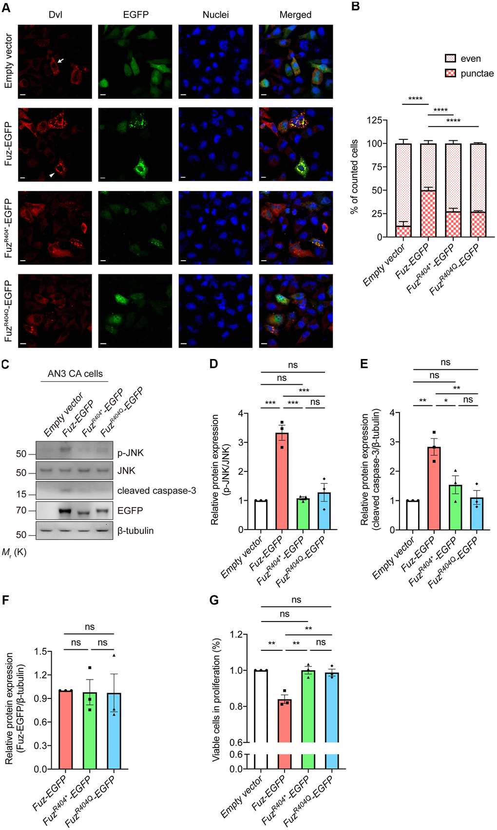 The mutant Fuz expression construct harboring R404* or R404Q mutation was generated (Supplementary Figure 5). Fuz was reported to trigger cell apoptosis via activating Dvl-Rac1-MAPK-caspase-3 signaling axis [23]. We then tested the activity of this apoptotic pathway in FuzR404* or FuzR404Q-expressing cells. When overexpressed in our HEK293 cell model, the wildtype Fuz protein activates Dvl protein aggregation (from 12.22% to 50.17%), whereas such activation was attenuated in FuzR404* (27.57%) or FuzR404Q (27.18%) overexpression cells (Figure 8A, 8B). Moreover, although expressed at comparable levels, the JNK-caspase-3 activation triggered by wildtype Fuz protein was found mitigated in FuzR404* or FuzR404Q-expressing cells (Figure 8C–8F). In addition, the Fuz-mediated suppression of cell proliferation was alleviated in FuzR404* or FuzR404Q overexpression cells (Figure 8G). Taken together, these functional experiments suggest that mutation at 404th arginine residue perturbs the biological function of Fuz in triggering apoptosis.