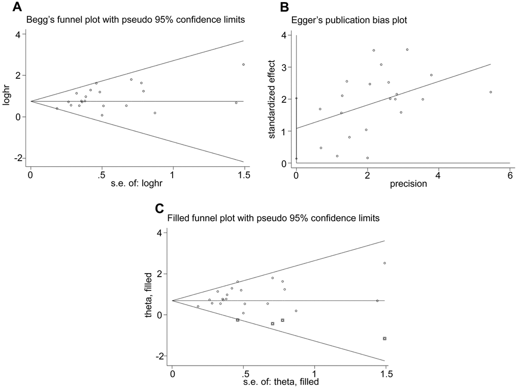 We then analyzed publication bias in studies regarding OS using Begg’s funnel plots and Egger’s test. Begg’s test did not show significant publication bias among the included studies (P = 0.156, Figure 6A). However, Egger’s test showed significant publication bias (P = 0.027, Figure 6B). Furthermore, the funnel plots were adjusted by using trim and fill method. The results were not significantly altered after adding 4 suppositional studies (HR = 0.683, 95% CI: 0.521–0.846; Figure 6C), indicating that our result was robust.