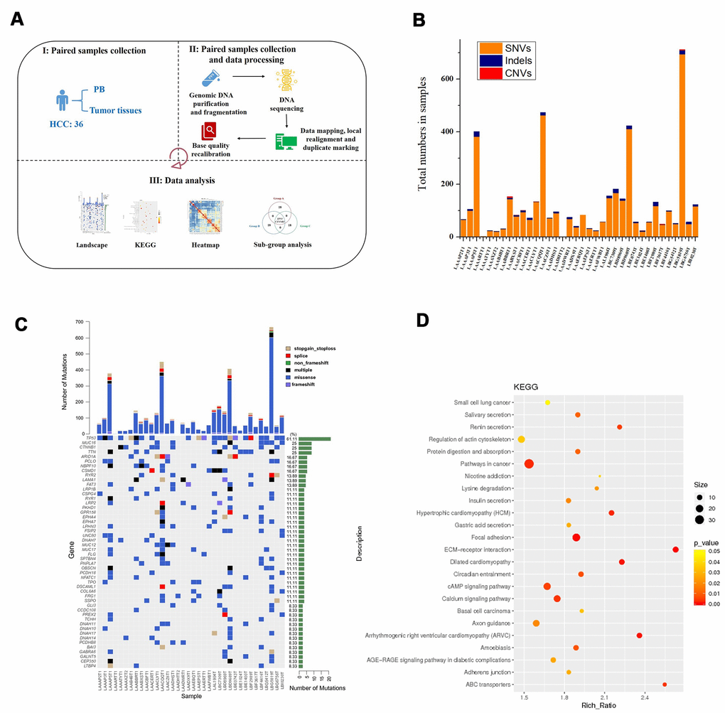Patient clinical characteristics are presented in Table 1. Briefly, all subjects were males with an average age of 48.33 ± 9.75 years. All patients had a history of HBV infection. The sample collection, sequencing, and data analysis are shown in Figure 1A. To identify the landscape of genetic mutations of HCC patients with HBV infection, WES was performed in 36 pairs of HCC samples; a total of 4231 somatic SNVs, 192 somatic indels, and 12 somatic CNVs were detected. The mean number of SNVs, indels, and CNVs in each patient was 117.5, 5.3, and 0.3, respectively (Figure 1B). According to the frequency of sample mutations, 8 genes (TP53, MUC16, CTNNB1, TTN, ARID1A, PCLO, NBPF10, and CSMD1) were identified with a high mutation frequency (> 15%) in HCCs (Figure 1C). TP53 is the most frequently occurring gene (61.1%). Compared to the most frequently mutated genes in HCC from the TCGA database, NBPF10 and CSMD1 were highly mutated genes in HCCs in the Chinese population. Furthermore, KEGG pathway analysis (P < 0.05, Figure 1D) identified representative HCC proteins and showed that the calcium signaling pathway, axon guidance, circadian entrainment, and nicotine addiction pathways were significantly enriched in HCC samples.