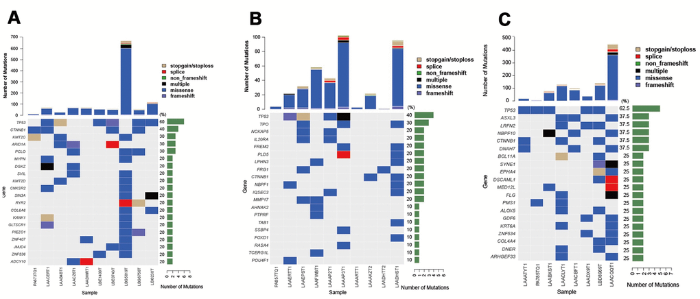 Genomic DNA was extracted from tumor tissues and matched to the PB samples. Genomic DNA libraries were prepared using the protocols provided by Illumina HiSeq2000 platform (Genetron Health Co., Ltd). WES was performed using a TruSeq Exome Enrichment kit (Illumina). The captured DNA libraries were sequenced on an Illumina HiSeq2000 Genome Analyzer. WES provided a 200× average coverage for tumor and PB samples. After raw data (FASTQ) were collected, quality control was performed. The BAM files were processed for local realignment, duplicate removal, and base quality recalibration using GATK (https://software.broadinstitute.org/gatk/) and Picard Tools (http://broadinstitute.github.io/picard/index.html). Mutations were annotated using ANNOVAR [27]. The tumor tissues and normal PB sequencing reads were compared to identify germline single nucleotide variants (SNVs)/insertions-deletions (indels) and somatic SNVs/indels/copy number variants (CNVs)/structural variations (SVs).