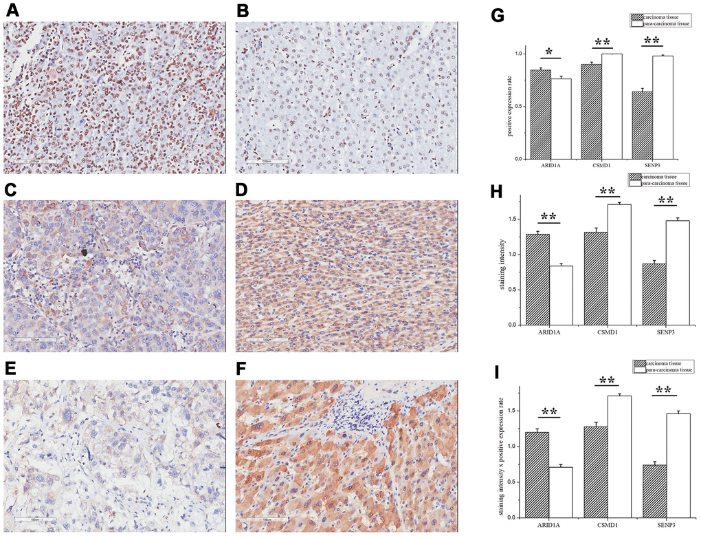 Herein, we focused on ARID1A, CSMD1, and SENP3 during tissue microarray analysis of 180 HCC samples paired with tumor and paracarcinoma tissues as a replication population. These three genes showed significantly high expression in HCC patients in the TCGA database. The clinical characteristics of these patients are presented in Table 4. The IHC analysis of ARID1A, CSMD1, and SENP3 proteins showed that the expression level of all the three genes was significantly different between tumor and paracarcinoma tissues (P < 0.05, Figure 3G–3I). The ARID1A expression was significantly increased in tumor tissues (P < 0.05, Figure 3A, 3B) consistent with the TCGA database. Surprisingly, the expression of CSMD1 and SENP3 was significantly decreased in tumor tissues (P-value < 0.05, Figure 3C, 3D for CSMD1, and Figure 3E, 3F for SENP3).