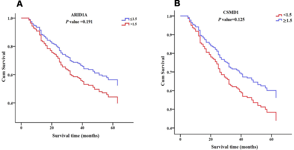 | ARID1A and CSMD1 | ≤1.5 for ARID1A and ≥1.5 for CSMD1 | >1.5 for ARID1A or <1.5 for CSMD1 | 0.218 | 0.685 (0.375–1.251) | |||||||||||||||||||||||||||||||||||||||||||||||||||||||||||||||||||||||||||||||||||||||||||||||