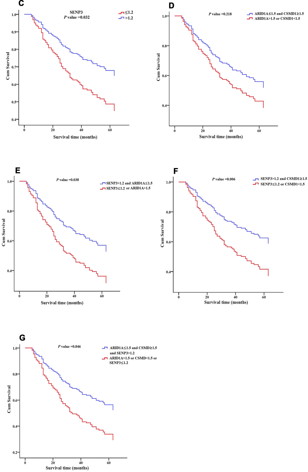 (C) Survival pattern of SENP3 expression. P = 0.032. (D) Survival pattern of combined ARID1A and CSMD1 expression. P > 0.05. (E) Survival pattern of combined ARID1A and SENP3 expression. P = 0.038. (F) Survival pattern of combined CSMD1 and SENP3 expression. P = 0.006. (G) Survival pattern of combined ARID1A, CSMD1, and SENP3 expression. P = 0.046. P < 0.05 indicates statistical significance.