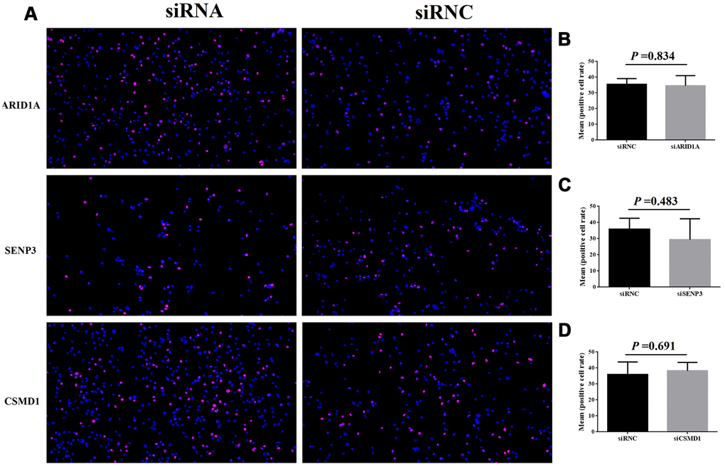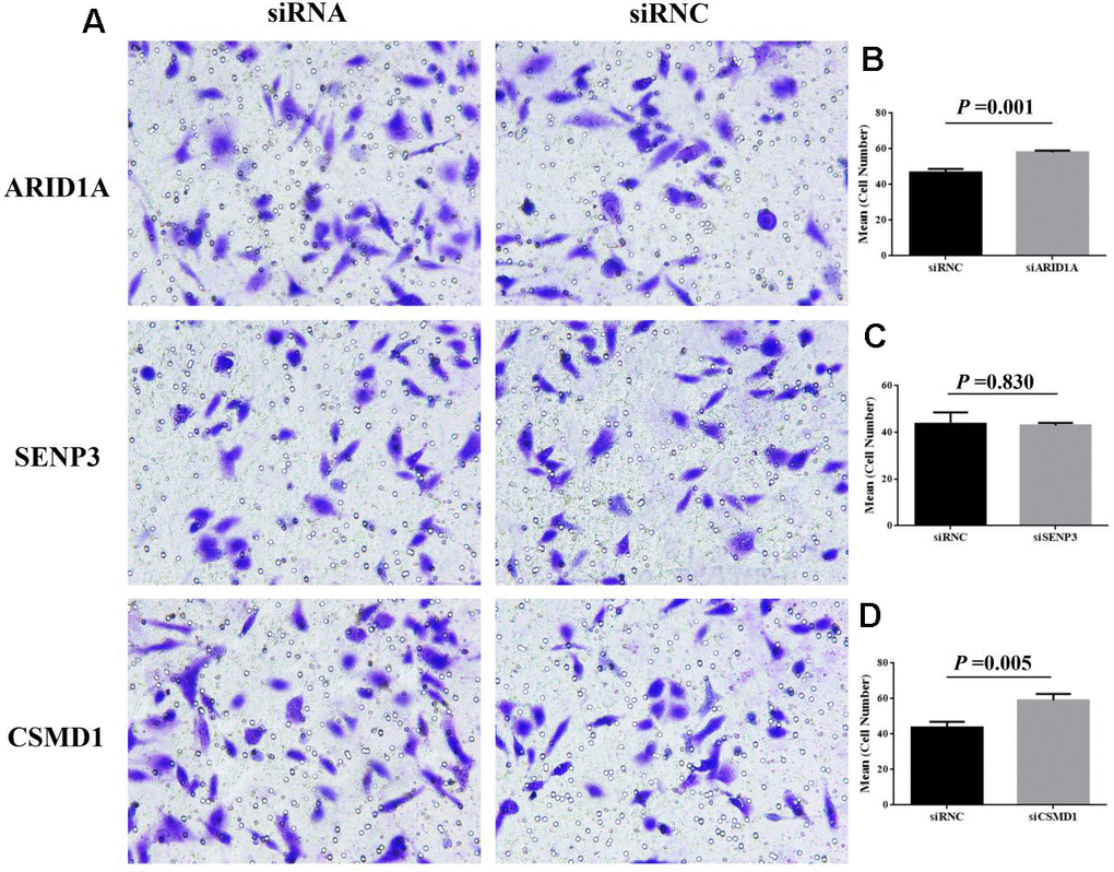 Finally, to verify the function of ARID1A, SENP3, and CSMD1 genes, we performed cell proliferation and invasion assays in the hepatic Hep3B cell line. In the EdU assay, after the suppression of ARID1A, SENP3, and CSMD1 genes by siRNAs, respectively, for 48 h, the cell proliferation rate was slightly increased by suppression of CSMD1 (Figure 6A, 6D, P > 0.05), slightly reduced by suppression of SENP3 (Figure 6A, 6C, P > 0.05), and almost unaltered by suppression of ARID1A (Figure 6A, 6B, P > 0.05). On the other hand, transwell invasion assay revealed that the cell invasion rate was unaltered by the suppression of SENP3 (Figure 7A, 7C, P > 0.05) but significantly increased by the suppression of CSMD1 (Figure 7A, 7D, P < 0.05), which was consistent with the results of tissue microarray analysis. Also, the suppression of ARID1A elevated the cell invasion rate (Figure 7A, 7B, P < 0.05), which was inconsistent with the results of tissue microarray analysis and TCGA database. Therefore, based on these functional assays, we deduced that CSMD1 prevented HCC by suppressing cell invasion.