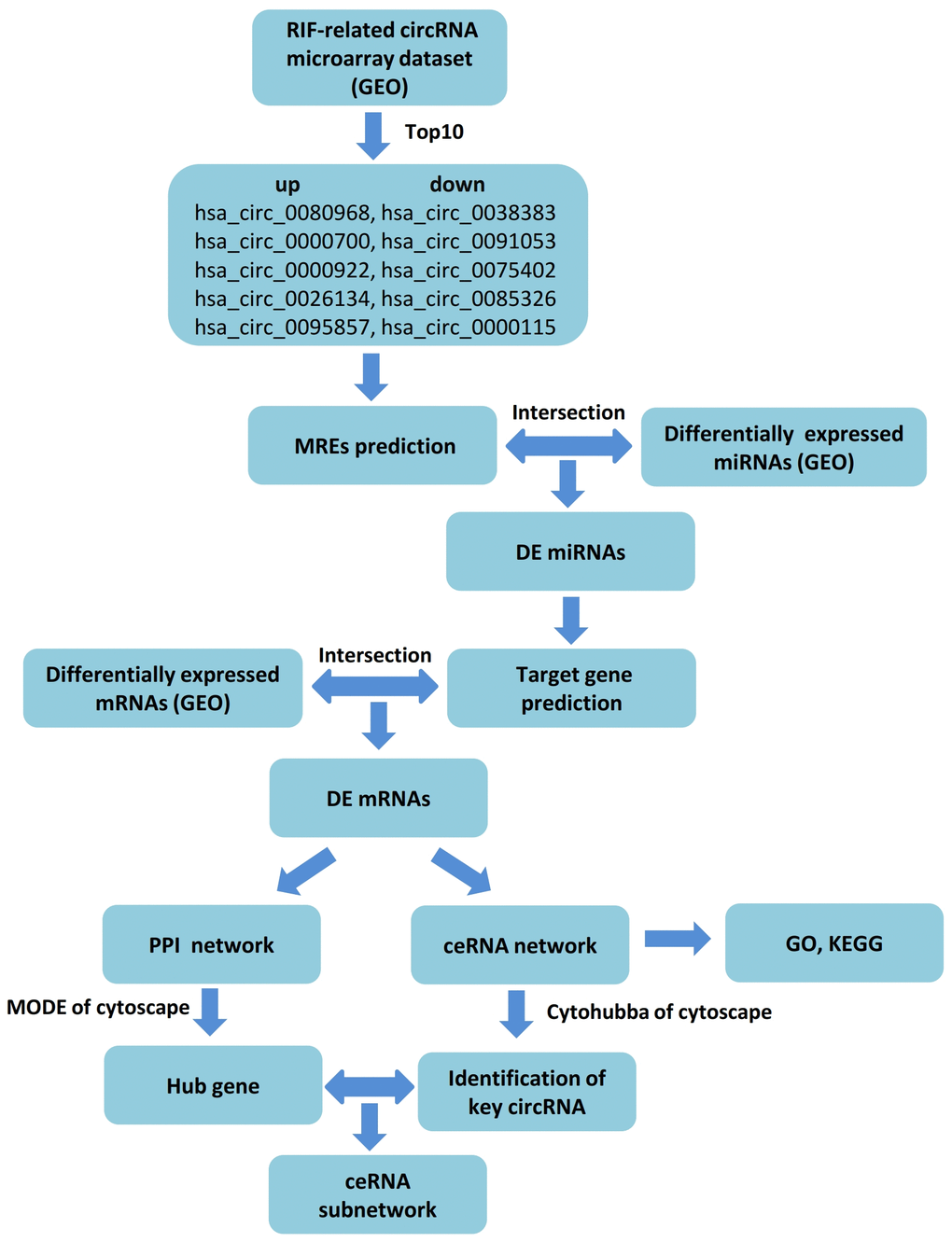 The competing endogenous RNA (ceRNA) hypothesis was described as ncRNAs regulating mRNA expression through competitively binding to shared miRNAs and forming a regulatory RNA network [19]. In recent years, it has been widely used in seeking candidate gene and exploring new mechanisms of circRNAs by constructing ceRNA regulated network based on bioinformatics analysis. Lu et al. found that hsa_circ_0011385 may play a key role in carcinogenesis-related pathways of bladder cancer as a ceRNA by identifying a circRNA–miRNA–mRNA regulatory network [20]. Another study disclosed that hsa_circ_0028883 could be regarded as a potentially reliable biomarker to diagnose active tuberculosis via comprehensive bioinformatics analysis and further verification with real-time quantitative polymerase chain reaction (RT-qPCR) [21]. In this study, we discussed the distinct circRNAs and their molecular mechanisms in RIF with the assistance of public databases. Firstly, we downloaded the expression profiles of circRNA (GSE147442), microRNA (GSE71332) and mRNA (GSE58144) of endometrium tissues of RIF patients and the control group from the Gene Expression Omnibus (GEO) database. Next, we selected the top 10 DEcircRNAs (5 upregulation and 5 downregulation) of GSE147442 as the initial candidates based on t-test. Then we established a circRNA–miRNA–mRNA regulation network depending on circRNA-miRNA interaction and miRNA–mRNA interaction by applying website tools and screening. Also, aim to expound the underlying mechanism of differently expressed mRNA (DEmRNAs) in ceRNA network, Gene Ontology (GO) analysis and Kyoto Encyclopedia of Gene and Genome (KEGG) pathway analysis were performed. Moreover, we chose three down-regulation circRNAs with a high degree of connectivity in ceRNA network as hub-circRNAs. While only hsa_circ_0038383 was identified with differential expression. Furthermore, hub genes of mRNA were screened out by a protein-protein interaction (PPI) network with Cytoscape MCODE (Molecular Complex Detection). Eventually, a circRNA-miRNA–mRNA subnetwork axis was successfully conducted. Thus, this research provided a forceful tool for searching potential biomarkers or therapeutic targets for RIF. A workflow summarizing our procedure is presented in Figure 1.