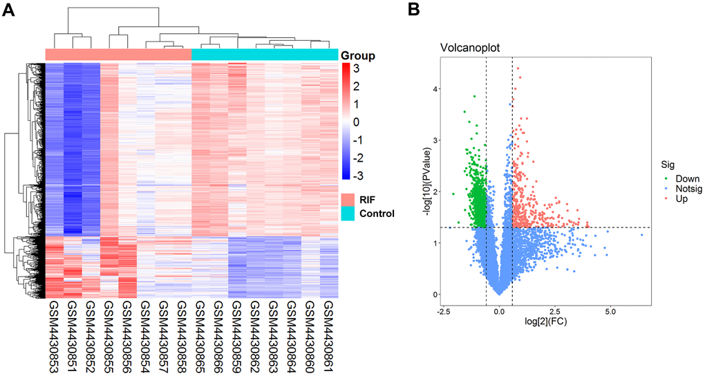 34 women (aged 24-40) treated at Reproductive Medicine Center of Yantai Yuhuangding Hospital were enrolled in our study. All of them signed informed consent forms approved by the Institutional Review Board of Yantai Yuhuangding Hospital (reference number 2019-121). The endometrial tissue samples in mid-secretory phase were obtained from RIF patients (n = 18) and control groups (n = 16), respectively. The women still did not get pregnancy after at least three IVF–ET failure cycles were assigned as RIF patients. The control women who experienced IVF–ET cycle due to tubal obstruction without hydrosalpinx achieved a clinical pregnancy after their first or second embryo transfer. Endometrium-related diseases, hydrosalpinx, polycystic ovarian syndrome (PCOS), etc. were excluded. All participants hold normal hormone level, normal endometrial thickness and morphology and a regular menstrual cycle (28-31 days).