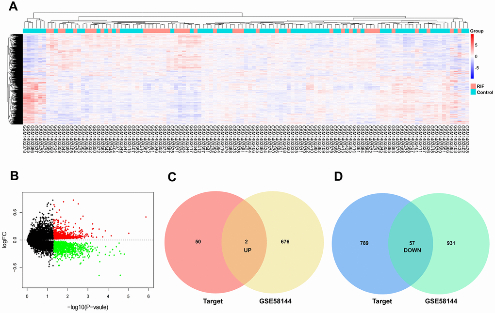 Using the same data processing method, 678 upregulation and 988 upregulation mRNAs in GSE58144 were selected (Figure 4A, 4B). On basis of similar methods, 59 candidate mRNAs were chosen, of which 2 were upregulated and 57 were downregulated (Figure 4C, 4D).
