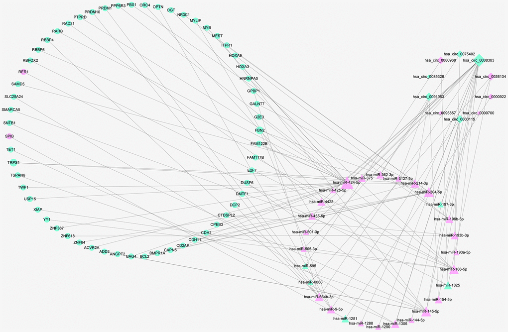 To better comprehend the role of circRNAs in miRNAs mediated mRNAs, a circRNA–miRNA–mRNA regulatory network was generated employing a combination of circRNA–miRNA pairs and miRNA–mRNA pairs after multiple screening steps. The ceRNA contained 33 circRNA–miRNA pairs and 63 miRNA–mRNA pairs, including 10 DEcircRNAs, 28 DEmiRNAs and 59 DEmRNAs. The subnetwork was presented using cytoscape software (Figure 5).