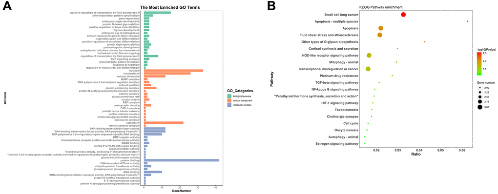 To find out the biological functions and pathway of DEmRNAs in ceRNA network, GO annotation and KEGG pathway analysis was performed. GO enrichment analysis was constituted with biological processes, molecular functions and cellular components. In biological process terms, the DEmRNAs were primarily involved in ‘regulation of transcription’ and ‘gene expression’. For cellular component terms, the DEmRNAs were mainly enrichment in ‘nucleus’, ‘nucleoplasm’, ‘transcription regulator complex’ and ‘cell-cell junction’. While ‘transcription factor activity’, ‘BMP receptor activity’, ‘transmembrane receptor protein serine/threonine kinase activity’ and ‘SMAD binding’ were mainly related to molecular function (Figure 6A). As shown in Figure 6B, KEGG pathway analysis indicated that the 59 aberrant DEmRNAs in RIF were significantly enriched in ‘apoptosis’, ‘fluid shear stress and atherosclerosis’, ‘NOD-like receptor signaling pathway’, ‘Mitophagy’, ‘TGF-beta signaling pathway’ and ‘NF-kappa B signaling pathway’, etc. (Figure 6B).