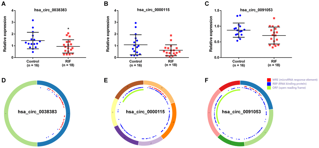 CircRNAs act as hub node in biological networks. Three down-regulation circRNAs (hsa_circ_0038383, hsa_circ_0000115 and hsa_circ_0091053) with high degree of connectivity calculated by the cytoHubba plugin of cytoscape were filtered as hub-circRNAs. Their basic characteristics were expressed in Table 3. To further assess the expression of these three selected hub DEcircRNAs, 18 RIF patients and 16 healthy women were included as a validation cohort. The detailed characteristics of these patients were summarized in Table 4. Full-length sequences were got from CircInteractome website, and sequences of specific primers for each circRNA were designed by Primer-BLAST in PubMed. The primers information was shown in Table 5. It was noteworthy that only hsa_circ_0038383 was significantly downregulated in endometrial tissues of RIF patients compared with control groups (Figure 7A). Hsa_circ_0000115 and hsa_circ_0091053 showed no significant difference (Figure 7B, 7C). The basic structural patterns of the three circRNAs were displayed in Figure 7D–7F. Consequently, hsa_circ_0038383 was selected as the circRNA target for future research.