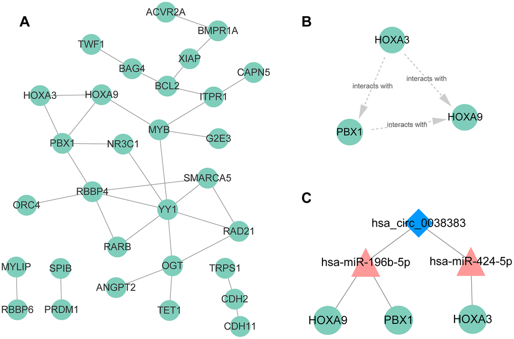 The PPI network was established based on protein interaction provided by STRING database. 30 nodes and 134 edges were included in this PPI network (Figure 8A). Then the most significant cluster in this PPI network was uncovered applying cytoscape MCODE module. The results indicated that only one cluster as key genes, including PBX1, HOXA9 and HOXA3 (Figure 8B). Based on the above results, we constructed a circRNA–miRNA–mRNA subnetwork, consisting of one DEcircRNA (hsa_circ_0038383), two DEmiRNAs (has-miR-196b-5p and has-miR-424-5p), and three DEmRNAs (HOXA3, HOXA9 and PBX1), which provided a novel insight in the pathogenesis and treatment of RIF (Figure 8C). Aimed to confirm whether the expression level of miRNAs and mRNAs in the particular axis is in accordance with prediction, we detected their expression in endometrial tissues of RIF patients compared with the healthy women. The results showed that only has-miR-196b-5p and HOXA9 was consistent the predicted results (Figure 9A–9E), which pointed that the hsa_circ_0038383/miR-196b-5p/HOXA9 axis may be a key pathway leading to RIF.