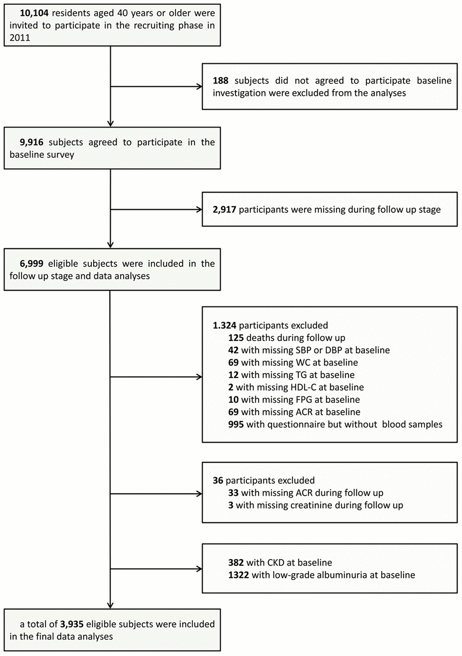 The participants for this study were collected from the Risk Evaluation of Cancers in Chinese Diabetic Individuals: A Longitudinal Study (the REACTION Study), and the detailed characteristics of these individuals are available in the literature [23–25]. All participants were 40 years of age or older and had self-care ability. Participants in the present prospective cohort study were recruited from one center in Guangzhou, China from June to November, 2011 according to the process outlined in the study flow diagram (Figure 1). A total of 10,104 qualifying residents were invited to participate through examination notices or home visits, and 9,916 individuals provided written consent for participation in the baseline survey, for a participation rate of 98.1%. For the data analysis, 382 individuals with CKD and 1322 individuals with low-grade albuminuria at baseline were excluded. A total of 2,917 participants were lost to follow-up, and thus, the follow-up rate in this study was 70.6%. Participants who did not provide all required information (n=1,360) were also excluded from the analyses. Accordingly, a total of 3,935 eligible participants were included in the final data analyses.