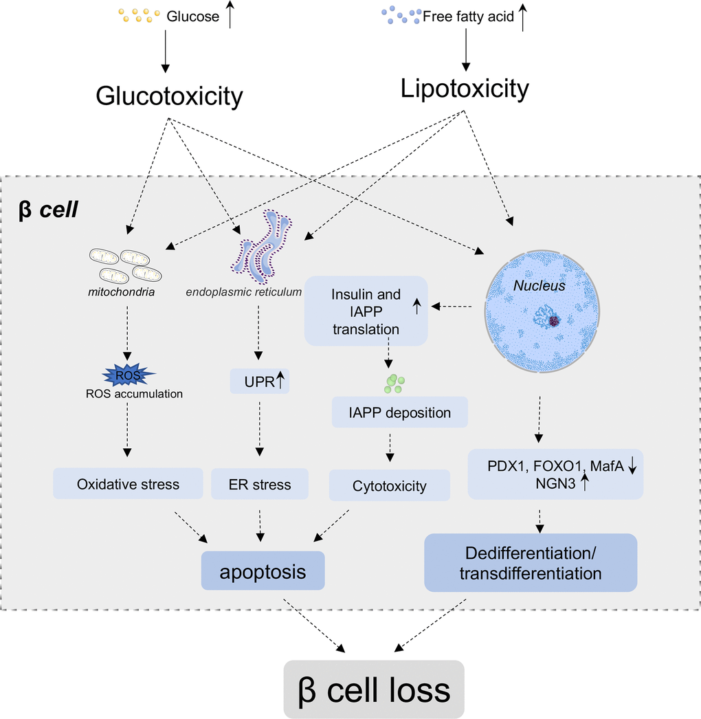 Apoptosis is a form of programmed cell death, which is implicated in the normal physiology of pancreatic development and final β cell mass formation [29]. The dynamic β cell mass is determined by the balance between β cell replication or neogenesis and apoptosis [30]. Glucotoxicity, lipotoxicity and islet amyloid polypeptide (IAPP) are the primary causative factors for increased β cell apoptosis in T2D, while ER stress and oxidative stress, as well as autophagy could be the link between upstream metabolic stimuli and downstream apoptotic machinery [31].
