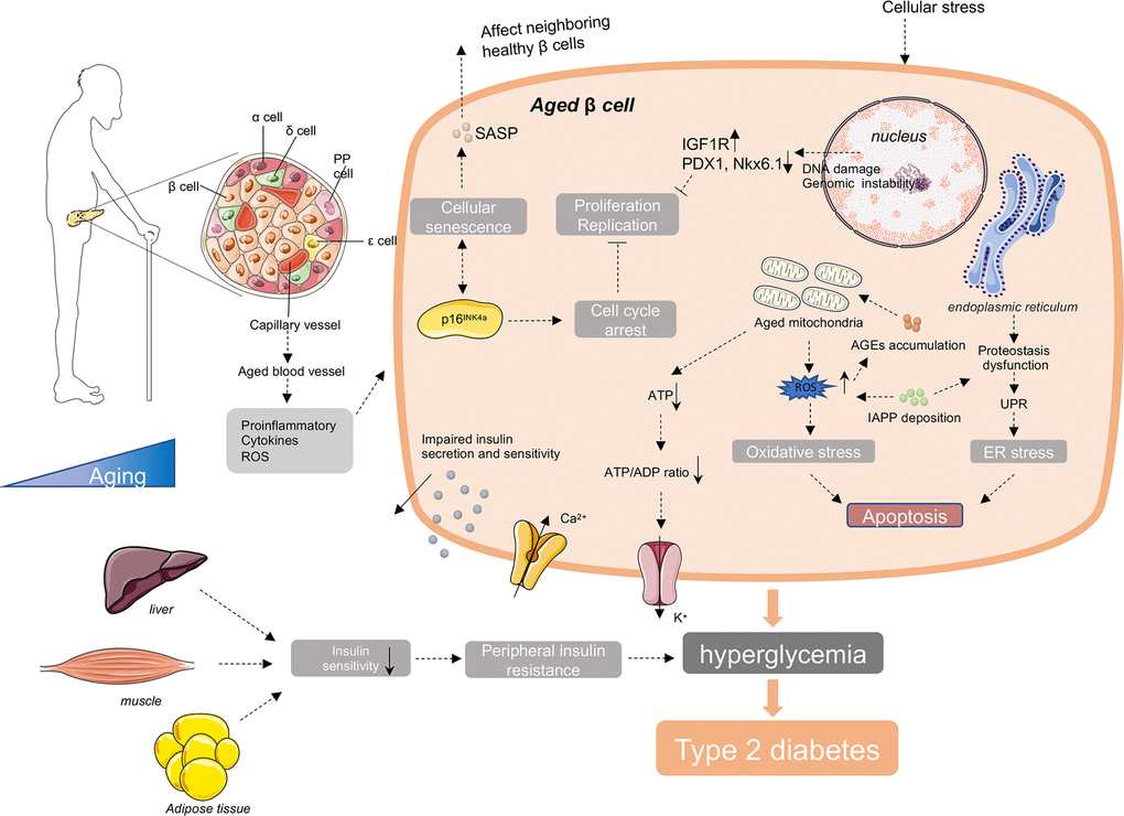 Type 2 diabetes is a complex systemic syndrome, with impacts on a wide spectrum of organs and tissues. Mounting pieces of evidence discloses that its morbidity increases with age. Although increasing number of studies have been carried out, aiming to disclose possible mechanistic interpretation for age-related T2D, our knowledge about it is still so limited. Taken together the up to date researches, we draw a conclusion that with advancing age, the pathological alterations of pancreatic β cells are supposed to be the key contributor to age-related T2D, and the decreased proliferation and regeneration potential, disturbed transcriptome and proteostasis, increased senescent cell accumulation and the influence of systemic environmental stress may lead to the loss of functional β cell mass and ultimately deficient insulin secretion and insulin action (Figure 2).