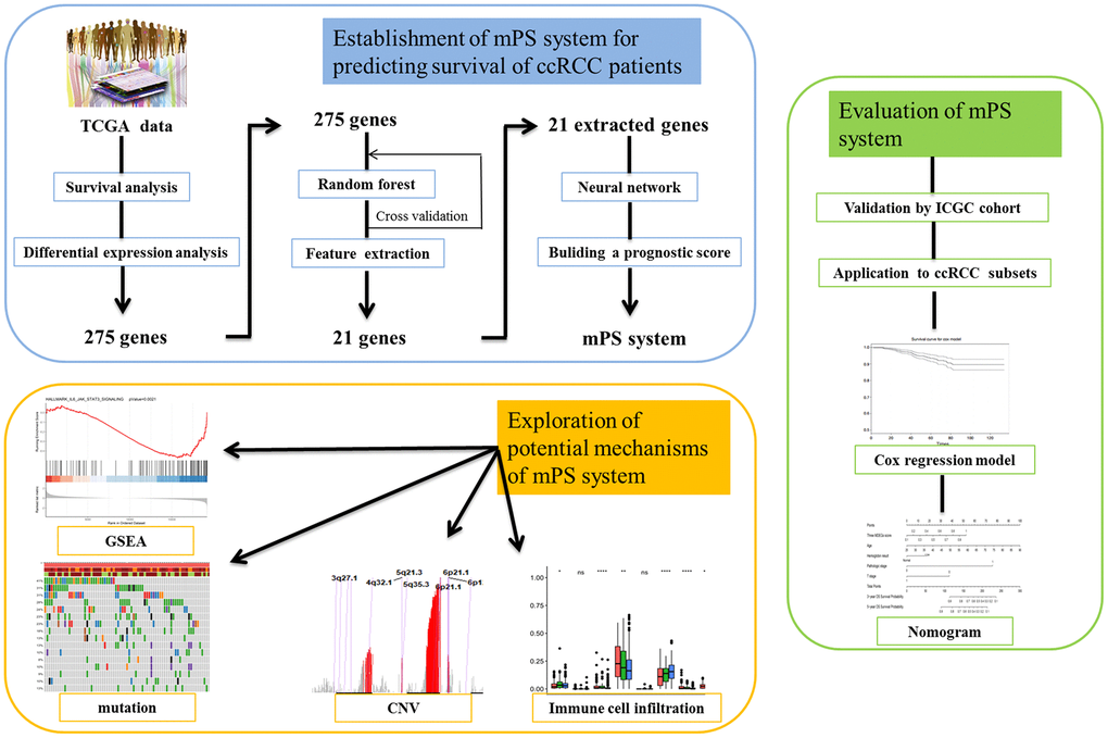 Although the advances of diagnostic techniques and comprehensive treatment have enhanced the survival and life quality of ccRCC patients to some extent, about 30% of patients undergoing curative nephrectomy still developed recurrence and metastasis when the clinical outcomes are poor. In recent years, the utilization of high-throughput sequencing technology has brought up a series of genome-wide biomarkers for ccRCC. However, they are still not enough for accurate prediction and individualized treatment. Therefore, exploring prognostic tools to more accurately manage patients with ccRCC with poor survival is becoming increasingly significant. In this study, we developed a new molecular prognostic signature (mPS system) to predict the overall survival of ccRCC patients.