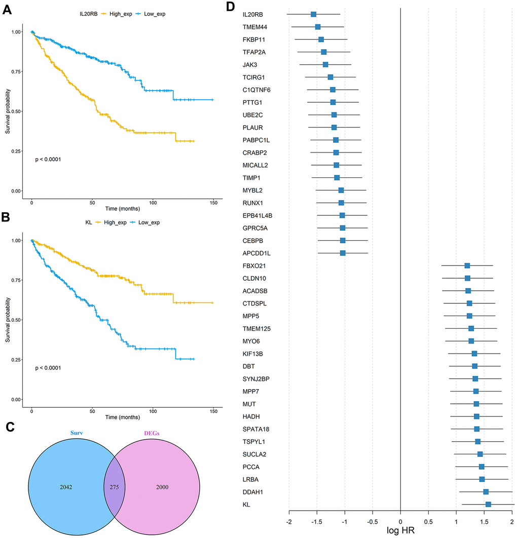The public data were retrieved from https://xenabrowser.net/datapages/. All human protein-coding genes were assessed the potential utility as a prognostic predictor with the TCGA ccRCC discovery cohort. The K-M method was performed for survival analysis by using R package survival and survminer [43]. According to the median value of gene expression, the ccRCC samples were divided into high or low expression group for a particular gene. The cox regression analysis in the survival package was applied to calculate the HR and 95% confidence interval (CI) of each prognosis-related gene. LIMMA R software package was used to analyze differential expressed genes [44]. The adj.P-value <0.05 and a |log2FC| >2 were regarded as the cutoff values of statistical significance.