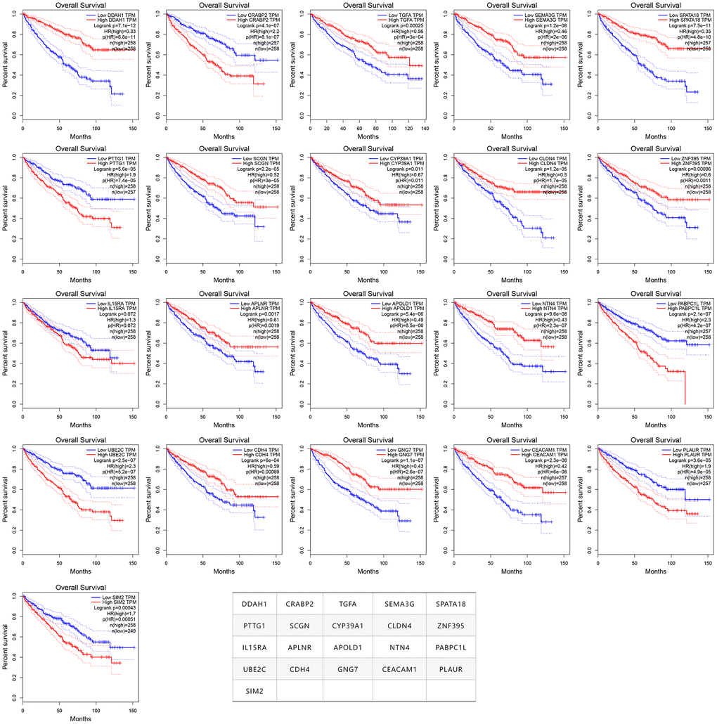 In order to verify whether these 275 genes are enough to predict the survival rate of ccRCC patients at 3 years, we used the TCGA ccRCC cohort to construct a molecular prognosis score system as illustrated in detail in the Materials and methods. We first used the random forest algorithm for feature gene screening. When the cutoff of feature importance was set to 0.5, a total of 21 genes were identified and then used for the following artificial neural network construction. The survival curves of the 21 genes were illustrated at Figure 3.