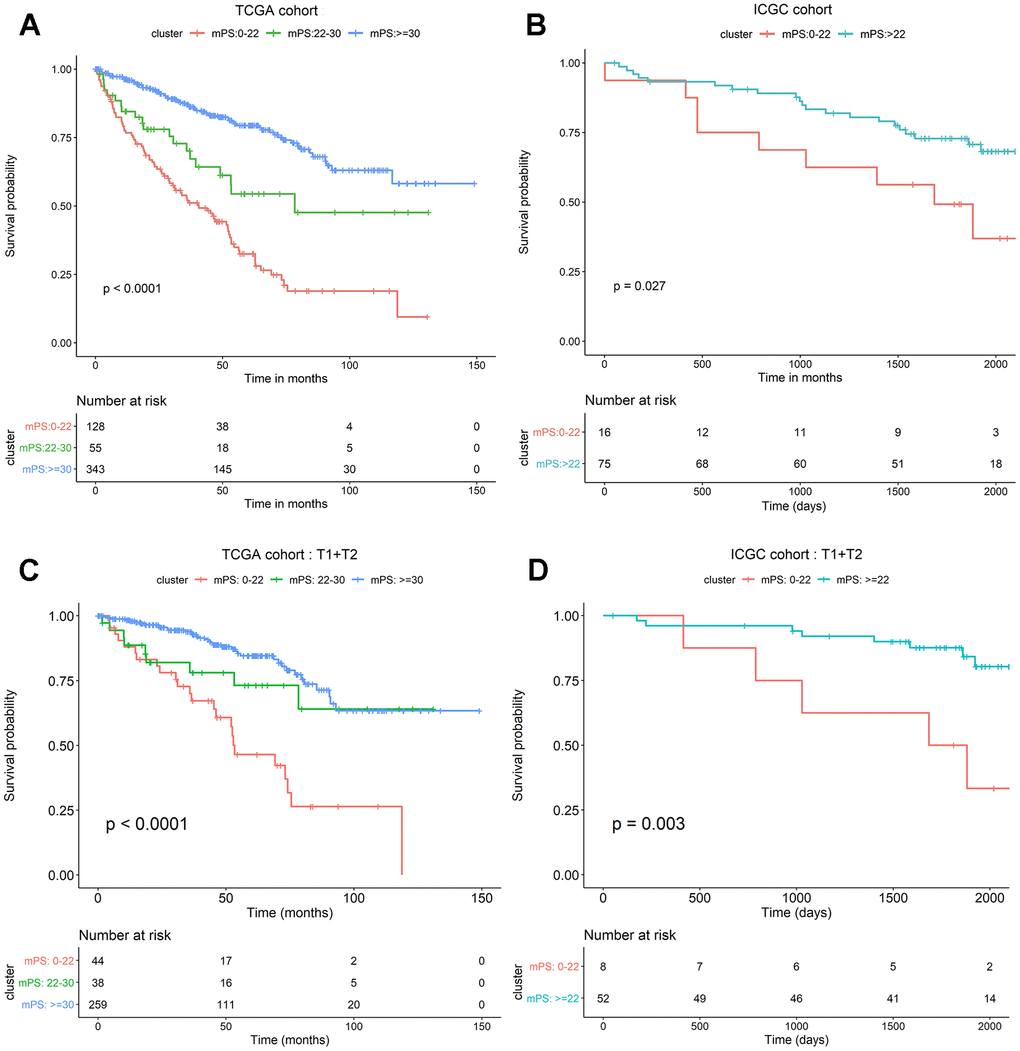 We further investigated whether mPS is also applicable to distinguish samples with different prognosis in different ccRCC subsets in TCGA data set. The results indicated that there was a significant difference regarding the prognosis among different mPS groups of patients in low-, median- and high-mPS groups at the clinical T1 and T2 stage in TCGA cohort (Figure 4C). Meanwhile, we also examined the utility of mPS for different TNM tumor stages determined from clinical information in ICGC cohort. The results suggested that the mPS system also stratified OS of patients in low- and high-mPS groups at the clinical T1 and T2 stage in the ICGC cohort (Figure 4D). We thus conclude that the mPS system can further stratify different ccRCC subsets in different ccRCC cohorts.