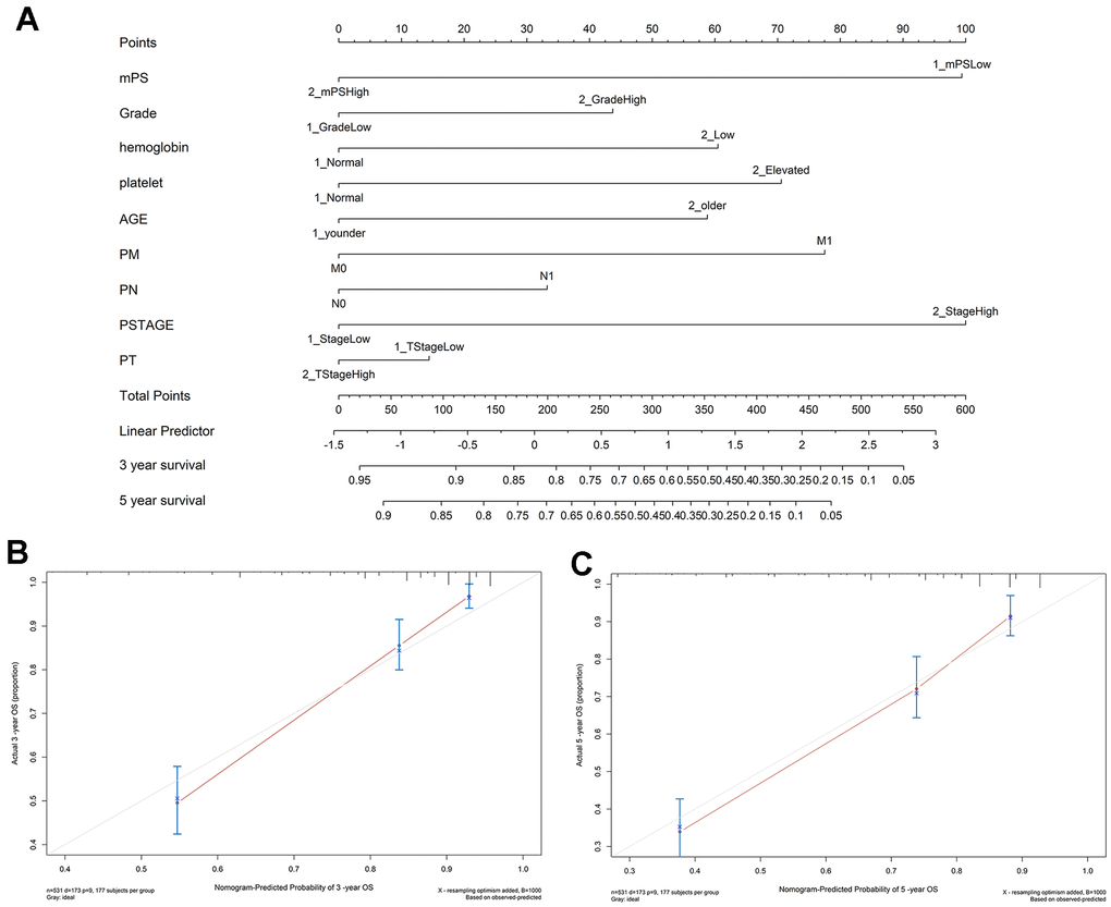 In order to gain an effective tool to predict the survival probability with ccRCC patients, a nomogram was constructed based on mPS and clinical information using the TCGA cohort. After integrating all significant independent variables, the final model was established and presented as a nomogram to estimate the probability of the 3- and 5-year OS for ccRCC (Figure 5A). C-index was calculated to assess the predictive value of the model. The nomogram had a C-index of 0.79, which revealed relatively high discrimination ability. In addition, the calibration plots exhibited optimal agreement between the model prediction and actual observation for predicting ccRCC survival probability at 3- and 5- year (Figure 5B, 5C).