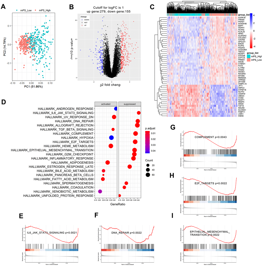 Based on the Limma R package, a total of 434 genes were identified to differentially express between low- and high-mPS groups, of which 279 genes were up-regulated and 155 genes were down-regulated in high-mPS group compared with low-mPS group. The principal component analysis result was plotted at Figure 6A while the volcano plot of the differentially expressed genes was illustrated at Figure 6B. In addition, the heat map of the top 50 differentially expressed genes was presented at Figure 6C. The differentially expressed genes were then selected for Gene set enrichment analysis (GSEA) analysis. As a result, a total of 20 prominent Kyoto Encyclopedia of Genes and Genomes (KEGG) pathways including activated and suppressed pathways were selected (Figure 6D). Activated pathways mainly includes ultraviolet (UV) response, transforming growth factor-beta (TGF-beta), heme metabolism, adipogenesis, and bile acid metabolism while suppressed pathways were mainly concentrated on IL6/JAK/STAT3 signaling, DNA repair, allograft rejection, complement, E2F targets, epithelial mesenchymal transition, G2M checkpoint, and inflammatory response. GSEA enrichment plots of representative gene sets on “epithelial mesenchymal transition”, “IL6/JAK/STAT3 signaling”, “complement”, “E2F targets”, and “DNA repair” were also shown in Figure 6E–6I.