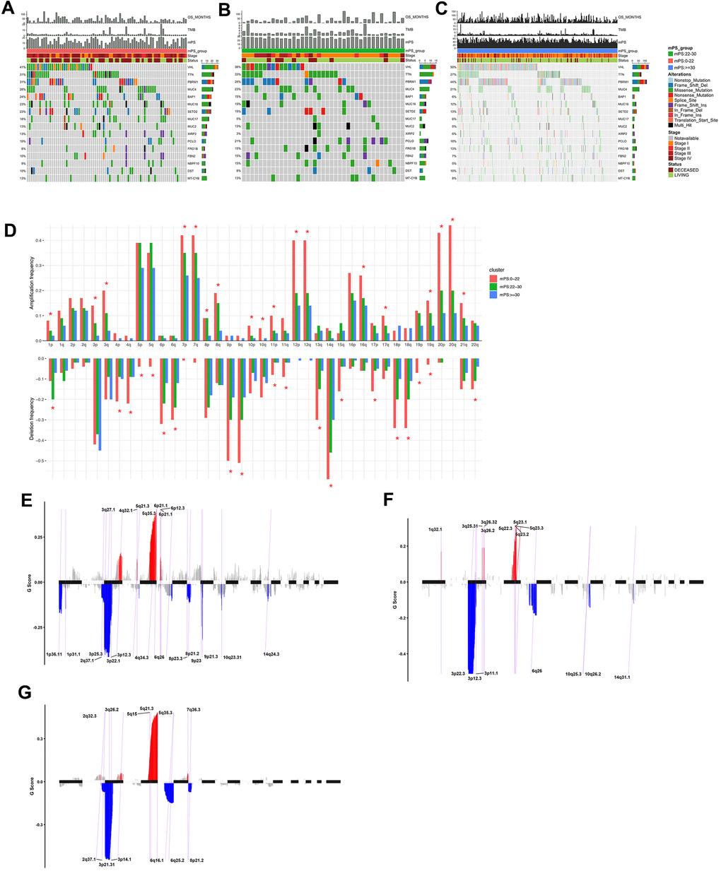 The segmented CNVs in the three subgroups of ccRCC samples were applied to screen the significantly frequent CNVs by the Genomic Identification of Significant Targets in Cancer (GISTIC) method. Specifically, in the low-mPS subgroups (mPS<20), the amplifications of 7q, 7p and deletions of 9p, 9q were identified more significant. In addition, in the median-mPS subgroups (22≤mPS<30), the amplifications of 5q, 5p and deletions of 3p, 4q were considered statistically significant. Moreover, in the high-mPS subgroups (mPS≥30), frequent amplifications were observed in chromosomal arms 7q, and 7p, and deletions were observed in 9p, and 9q. Chi-square test was performed on the frequency distribution of each chromosome arm. The frequency distribution of amplification and deletion of chromosome arms in the three groups of samples obtained by GISTIC analysis were presented at Figure 7D.