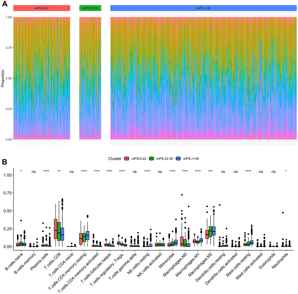 Immune cell infiltration has been recognized as one of the most important factors that may positively or negatively shape tumor initiation, progression, or survival outcome. In this study, we analyzed the composition of tumor-infiltrating immune cells in ccRCC samples based on the RNA-seq data of ccRCC samples in TCGA using CIBERSORT. When characterizing the abundances of different immune cell types with CIBERSORT, 22 subsets of tumor-infiltrating immune cells in 531 samples were obtained at a threshold of P-value < 0.05, including memory B cells, activated dendritic cells, and M0 macrophage. The distribution results of the inferred fractions of immune cell populations in different samples produced by CIBERSORT were illustrated at Figure 8A. In addition, Figure 8B depicted the differences of the ratio distributions of 22 infiltrating immune cells in the three subgroups of samples including low-mPS, median-mPS, and high-mPS group. The significant immune gene signatures among the three groups included signatures for naive B cells, plasma cells, CD8 T cells, CD4 memory resting T cells, CD4 activated memory T cells, follicular helper T cells, regulatory tregs T cells, resting NK cells, monocytes, M0 macrophages, M1 macrophages, M2 macrophages, resting mast cells, and neutrophils, suggesting that considerable variability existed in the nature of the tumor immune infiltrate across different subgroups of ccRCC stratified by the mPS system, partly accounting for molecular features of the tumor underlying mPS system.