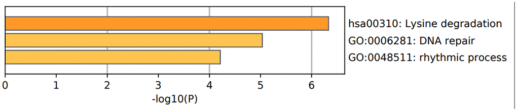 Overall, the most enriched GO terms with the four potentially prognostic epigenetic regulatory genes were DNA repair (GO: 0006281) and rhythmic process (GO: 0048511) (Figure 10 and Table 4).