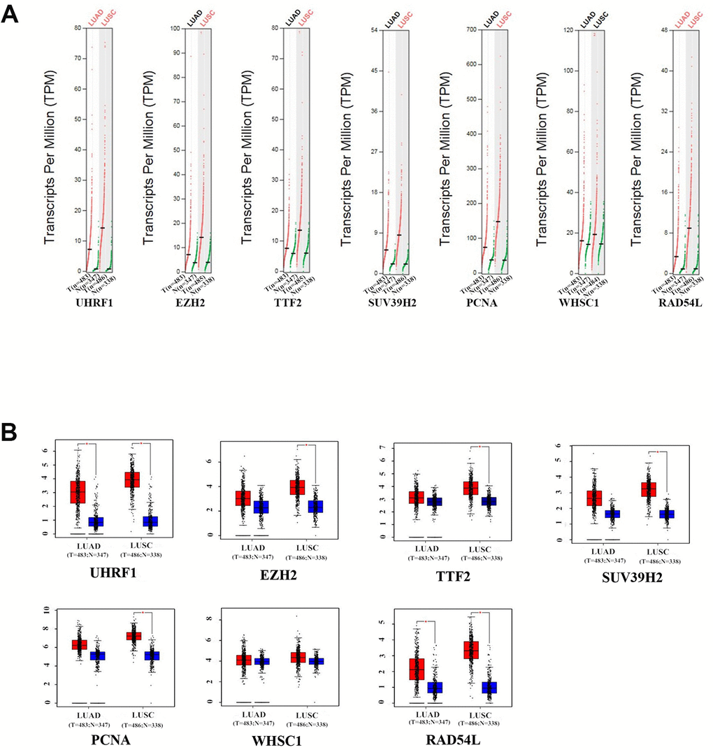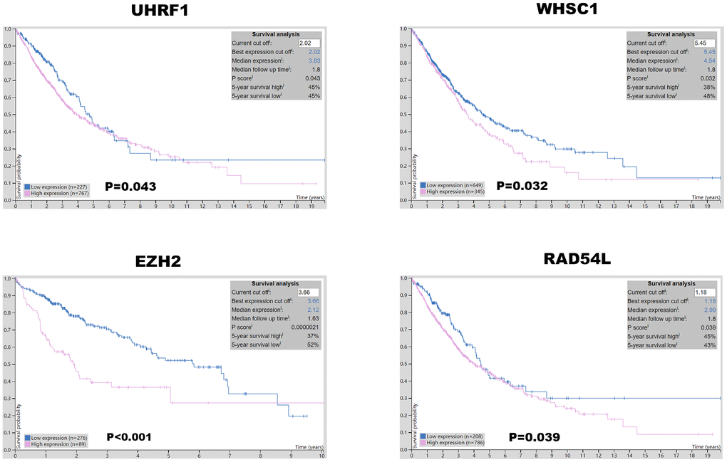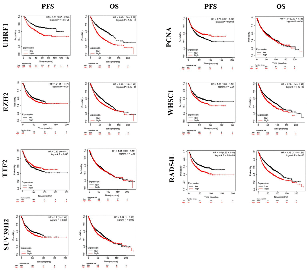 Aberrant epigenetic regulation plays a critical role in tumorigenesis by altering genome-wide gene expression [22]. In this study, we comprehensively investigated the prognostic value of multiple epigenetic regulatory genes such as UHRF1, EZH2, TTF2, SUV39H2, PCNA, WHSC1, and RAD54L in NSCLC tissues using public databases.