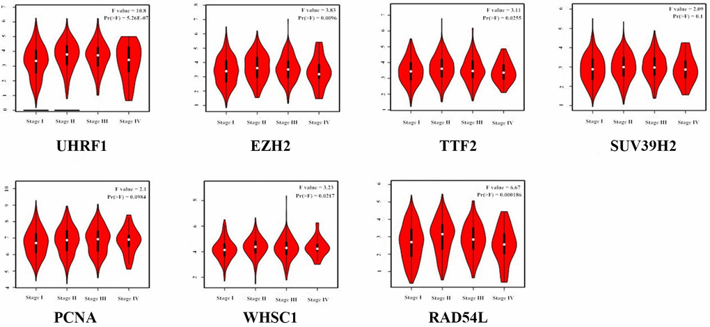 GEPIA (Gene Expression Profiling Interactive Analysis) database (http://gepia.cancer-pku.cn/detail.php) analysis results showed that UHRF1, EZH2, TTF2, SUV39H2, PCNA, WHSC1 and RAD54L mRNA levels were significantly upregulated in LUAD and LUSC tissues compared to the normal lung tissues (Figure 2). Furthermore, expression levels of UHRF1, EZH2, TTF2, WHSC1 and RAD54L transcripts correlated significantly with the tumor stages of NSCLC patients (P<0.05; Figure 3). However, the expression levels of SUV39H2 and PCNA transcripts did not show any significant association with the tumor stages of NSCLC patients (P>0.05; Figure 3).