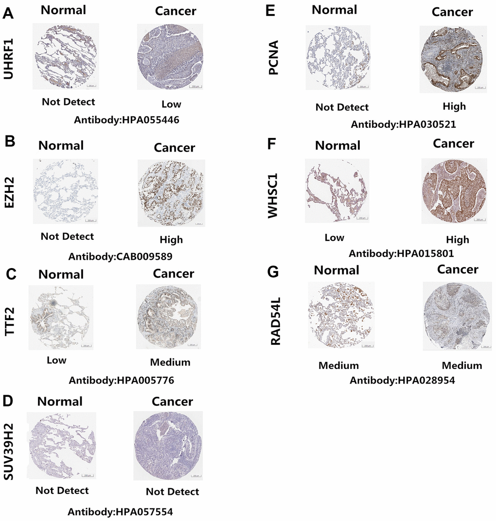 The Human Protein Atlas (http://www.proteinatlas.org/) database analysis showed that UHRF1, EZH2, TTF2, PCNA, and WHSC1 protein levels were significantly upregulated in NSCLC tissues compared to the normal lung tissues (Figure 4A–4C, 4E, 4F). However, the expression levels of SUV39H2 and RAD54L proteins were similar in the NSCLC and normal lung tissues (Figure 4D, 4G)