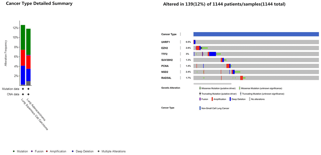The cBioPortal database (https://www.cbioportal.org/) was used to analyze the frequency of mutations and copy number alterations in the epigenetic regulatory genes in the lung cancer tissue samples from The Cancer Genome Atlas (Pan-Lung Cancer, TCGA, Nat Genet 2016) dataset.