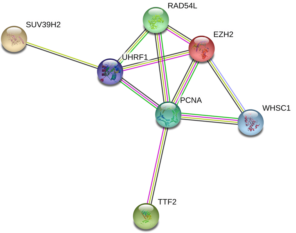 Protein-protein interaction network analysis of the seven epigenetic regulatory genes and their co-expressing genes using String database (https://string-db.org/) showed co-expression of RAD54L and EZH2, TTF2 and PCNA, as well as UHRF1 and PCNA (Figure 9).