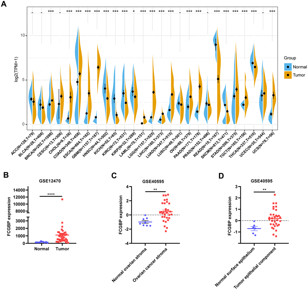FCGBP expression and clinical data of TCGA pan-cancer data and GTEx were obtained from the UCSC Xena database (https://xenabrowser.net/datapages/). The full names of TCGA tumor abbreviations were supplied in Supplementary Table 1. To evaluate FCGBP expression, tumor tissues were obtained from TCGA, and normal tissues were combined with normal tissues from the TCGA and GTEx databases. Ovarian cancer microarray data were obtained from the GEO database, including GSE12470 (Platform: GPL887) and GSE40595 (Platform: GPL570).