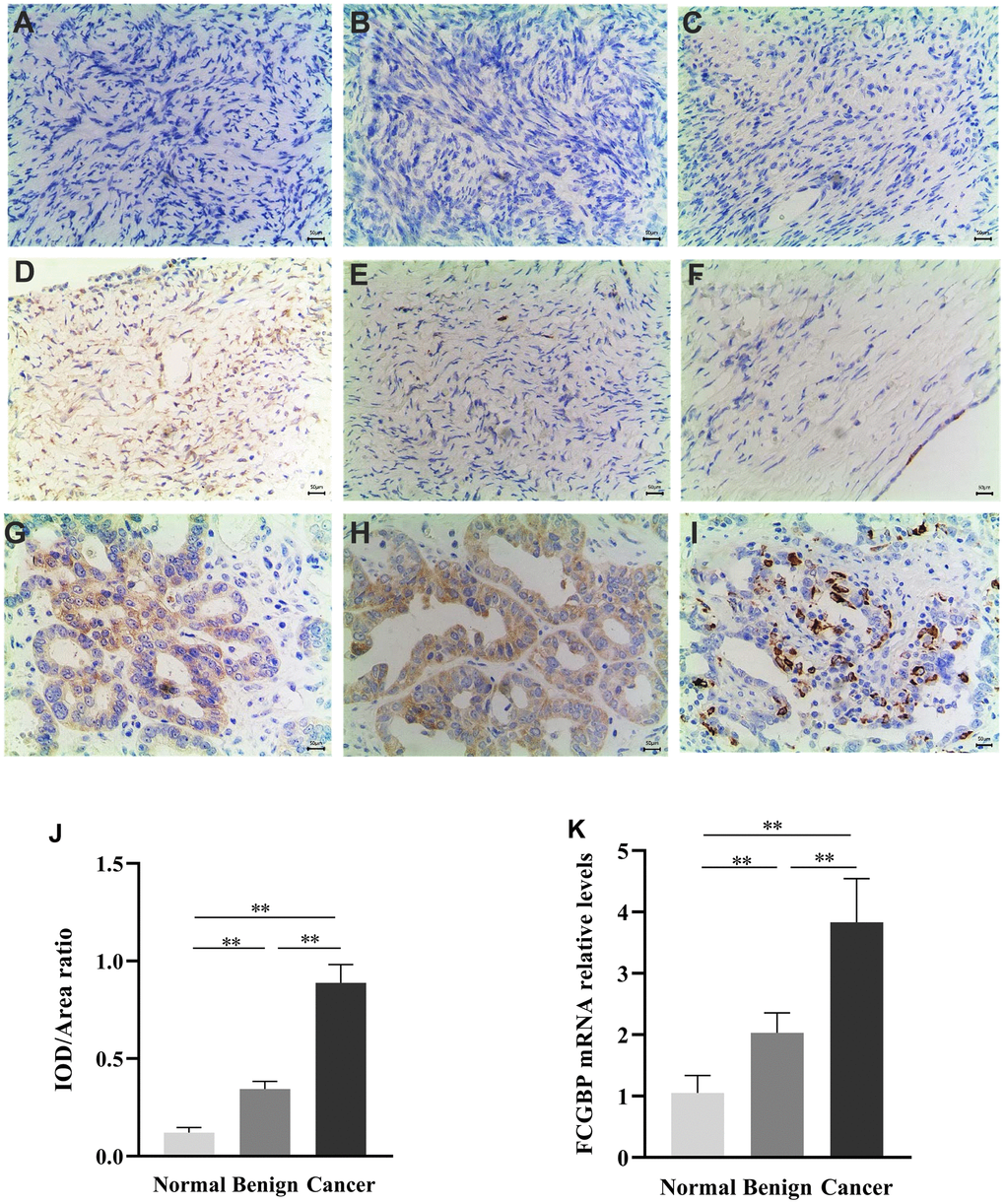 Human ovarian tumor specimens were obtained from the Department of Obstetrics and Gynecology, Taizhou Hospital of Zhejiang Province, Wenzhou Medical University. All experiments involving human tissues were in accordance with the principles of the Declaration of Helsinki and were approved by the Institutional Review Board of Taizhou Hospital. The primary antibodies and antigen retrieval regimes used were as follows: anti-FCGBP (Abcam [Ab121202], Cambridge, UK). The IOD/area ratio was calculated using ImagePro Plus 6.0. Statistical analyses were conducted using the GraphPad Prism 8.0.1 software. Statistical significance was evaluated using two-tailed t-tests: *p < 0.05, **p < 0.01, and ***p < 0.001.
