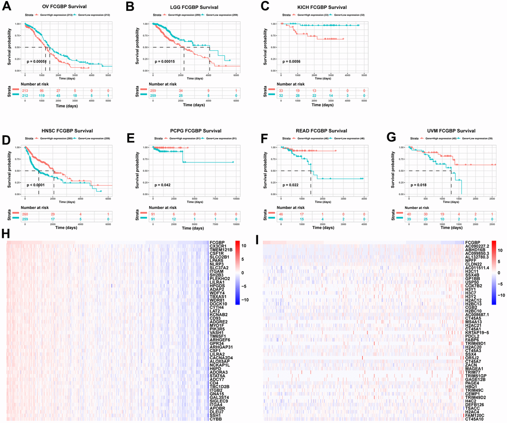To evaluate the value of FCGBP in predicting the prognosis of cancer patients, the association between FCGBP expression and OS, DSS, and the progression-free interval was analyzed in TCGA cohort. For OS, higher expression of FCGBP was significantly associated with reduced OS in OV (p = 0.00051), LGG (p = 0.00015), and KICH (p = 0.0056) (Figure 3A−3C). In contrast, HNSC (p < 0.0001), PCPG (p = 0.042), READ (p = 0.022), and UVM (p = 0.018) displayed trends toward improved survival with increasing FCGBP expression (Figure 3D−3G). Higher FCGBP expression was significantly associated with increased DSS in HNSC (p < 0.0001), BRCA (p = 0.03), PCPG (p = 0.019), and KIRC (p = 0.046; Supplementary Figure 1A−1D) and with poor DSS in OV (p = 0.0012), KICH (p = 0.02), and LGG (p = 0.00012; Supplementary Figure 1E−1G). In addition, the progression-free interval increased in the high FCGBP expression group in THCA (p = 0.0042), UCEC (p = 0.039), UVM (p = 0.012), and HNSC (p < 0.0001; Supplementary Figure 1H−1K), while it was reduced in KICH (p = 0.041) and LGG (p < 0.0001; Supplementary Figure 1L−1M).
