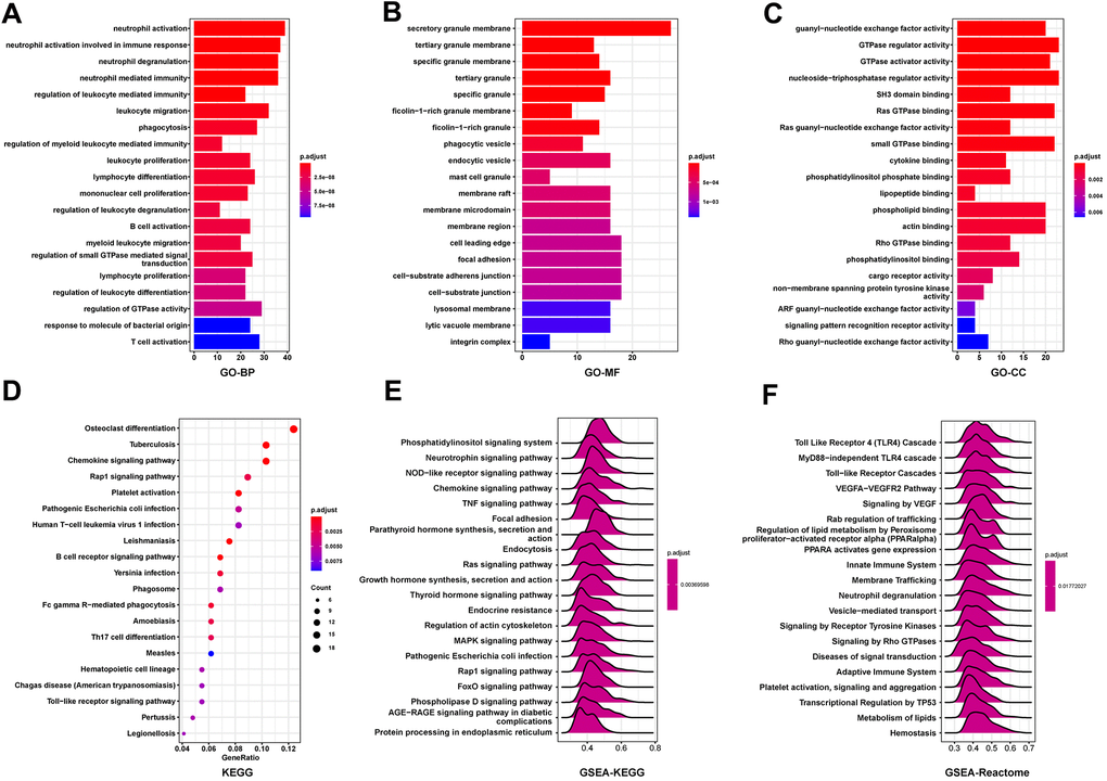 To predict the function of FCGBP, including associated pathways, we performed a correlation analysis between FCGBP and other genes in ovarian cancer using TCGA data (Figure 3H−3I). The top 300 genes that associated most positively with FCGBP were selected for enrichment analysis. We further explored the potential functional pathways based on the top 300 genes using the clusterProfiler R package. Functional enrichment and Gene Ontology (GO) analysis revealed that FCGBP was primarily associated with immune-related gene terms, including regulation of leukocyte-mediated immunity, leukocyte migration, leukocyte proliferation, B cell activation, and T cell activation (Figure 4A−4C). In addition, Kyoto Encyclopedia of Genes and Genomes (KEGG) pathway analysis indicated an enrichment and crosstalk of the top 300 genes in chemokine, RAP1, and B cell receptor signaling pathways, as well as human T cell leukemia virus 1 infection (Figure 4D). Gene Set Enrichment Analysis (GSEA) was used to search for KEGG and Reactome pathways, which revealed that the phosphatidylinositol, neurotrophin, NOD-like receptor, and chemokine signaling pathways were significantly enriched (Figure 4E). In addition, Toll-like receptor 4 (TLR4) cascade, MyD88-independent TLR4 cascade, Toll-like receptor cascades, and VEGFA−VEGFR2 pathway were significantly enriched by Reactome pathway analysis (Figure 4F). These results suggest that FCGBP is associated with many malignancy-related pathways in ovarian cancer, especially immune-related pathways.