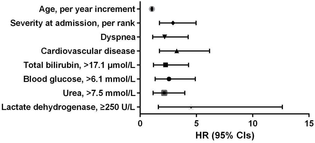 Demographic, clinical, and laboratory parameters were included in prognostic models for COVID-19. The current model included eight predictors (age, severity at admission, dyspnea, cardiovascular disease, and levels of lactate dehydrogenase, total bilirubin, blood glucose, and urea). Of them, age and comorbidity with cardiovascular disease have been reported in previous models to be risk factors for either mortality or disease progression [9, 13–16]. Severity at admission was mainly determined by SpO2 and CT imaging, as detailed before [17]. The prevalence of dyspnea is barely higher in patients who develop acute respiratory distress and have the poorest clinical outcomes, and was suggested to be a risk factor for predicting mortality in patients with COVID-19 [18, 19].