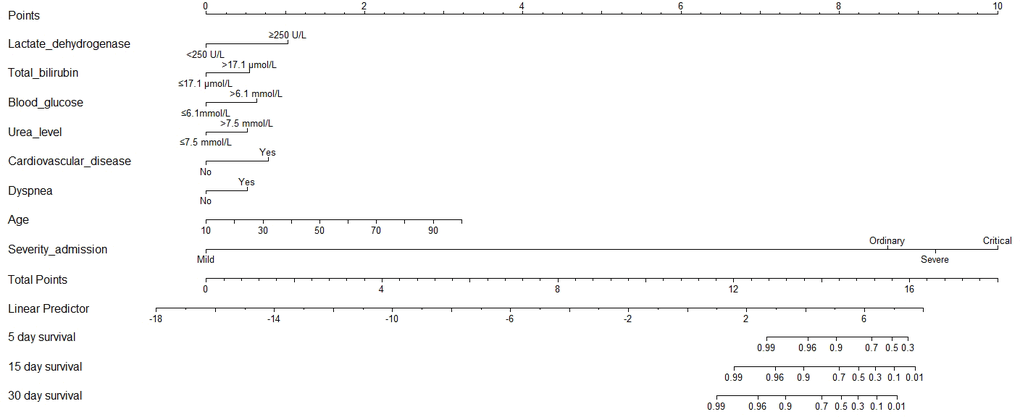 As for laboratory markers in the current model, the involvement of total bilirubin, blood glucose, urea, and lactate dehydrogenase indicates that involvement of multi-organ dysfunction represents a major predictor of in-hospital mortality for COVID-19 patients. In another recent nomogram, high direct bilirubin level was found to be an independent predictor of 28-day mortality in adult hospitalized patients with confirmed COVID-19 [7]. However, another study with a larger sample size found that AST abnormality, rather than bilirubin, was strongly associated with COVID-19 mortality risk [20]. A recent meta-analysis concluded that comorbid diabetes was associated with an increased risk of disease severity or death in Chinese COVID-19 patients, while it is still not clear to what extent diabetes independently contributes to the increased risk [21]. Besides, acute kidney injury is associated with severe infection and fatality in patients with COVID-19 [22]. The combination of blood urea nitrogen and D-Dimer were predictors of in-hospital mortality in 305 COVID-19 patients, with 27.9% mortality [23].