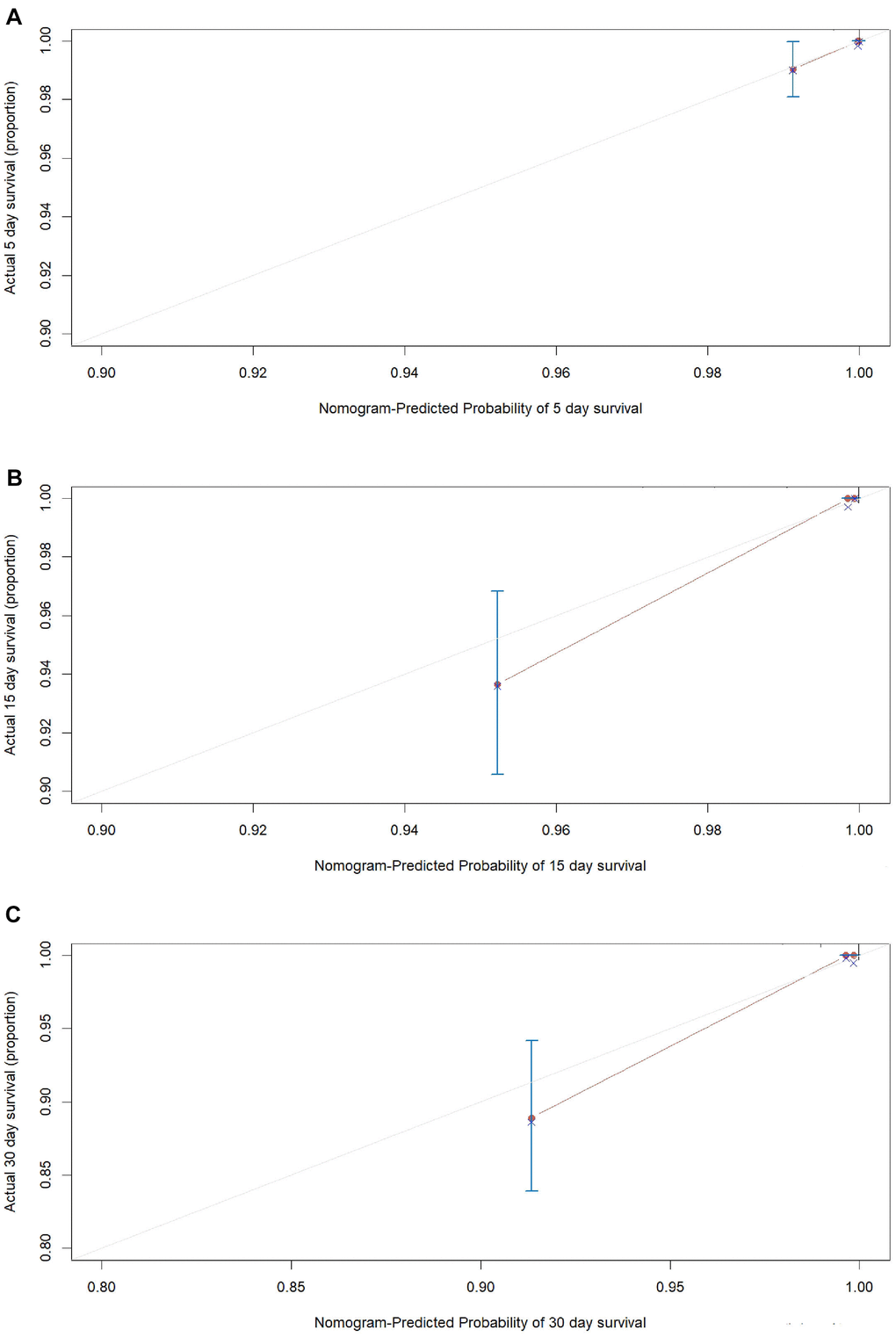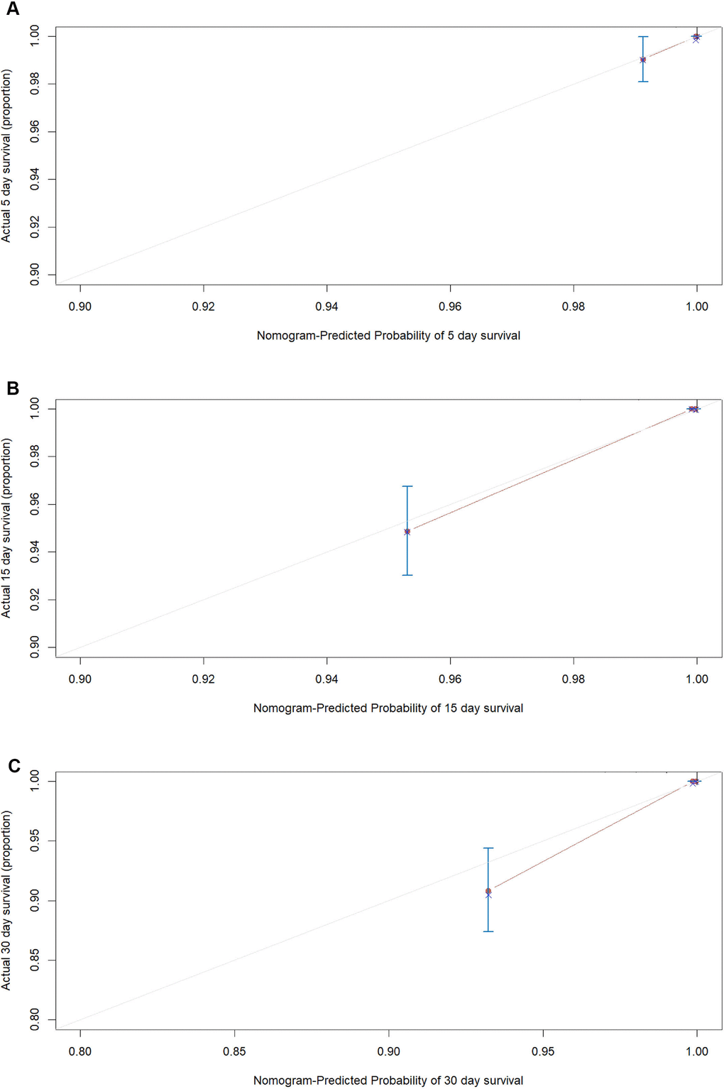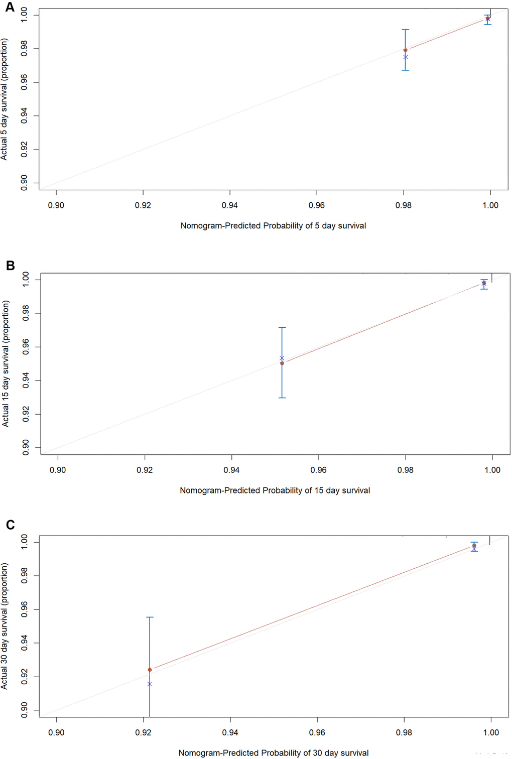 An internal validation of the prognostic nomogram was conducted in 1,242 COVID-19 cases (22 deaths), while an external validation was conducted in 1,064 COVID-19 cases from Taikang-Tongji hospital (29 deaths). The C-index for in-hospital mortality prediction of COVID-19 was 0.96 (95% CI, 0.94 to 0.98, P<0.001) for the internal validation. For the external validation, the C-index for in-hospital mortality prediction of COVID-19 was 0.92 (95% CI, 0.86 to 0.98, P=9.7×10-38). The calibration plot of both internal validation (Figure 4) and external validation (Figure 5) for the probability of survival at 5-,15-, and 30-days after admission also showed an optimal agreement between the prediction by nomogram and actual observation.