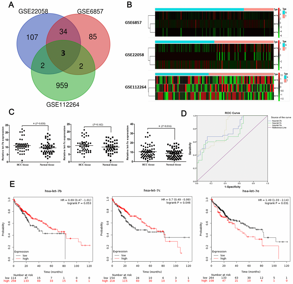 We performed a comprehensive differential analysis of miRNA expression based on three GEO DataSets (GSE6857, GSE22058 and GSE12264) in order to identify dysregulated miRNAs in HCC tissue compared with non-tumor normal controls (NCs). Datasets GSE6857, GSE22058 and GSE12264, respectively, contained 124, 146 and 966 miRNAs. By merging the three datasets, we were able to identify three consistently dysregulated miRNAs (hsa-let-7b, hsa-let-7c and hsa-let-7e) in HCC tissue versus NCs (Figure 1A). The expression profiles of these distinct miRNAs are shown in the heatmaps in Figure 1B. heatmaps. Considering the widely differing expression levels of hsa-let-7b, hsa-let-7c and/or hsa-let-7e between cancerous and non-tumor tissues, we selected them for further investigation of whether, when dysregulated, they could serve as diagnostic and prognostic markers in HCC.