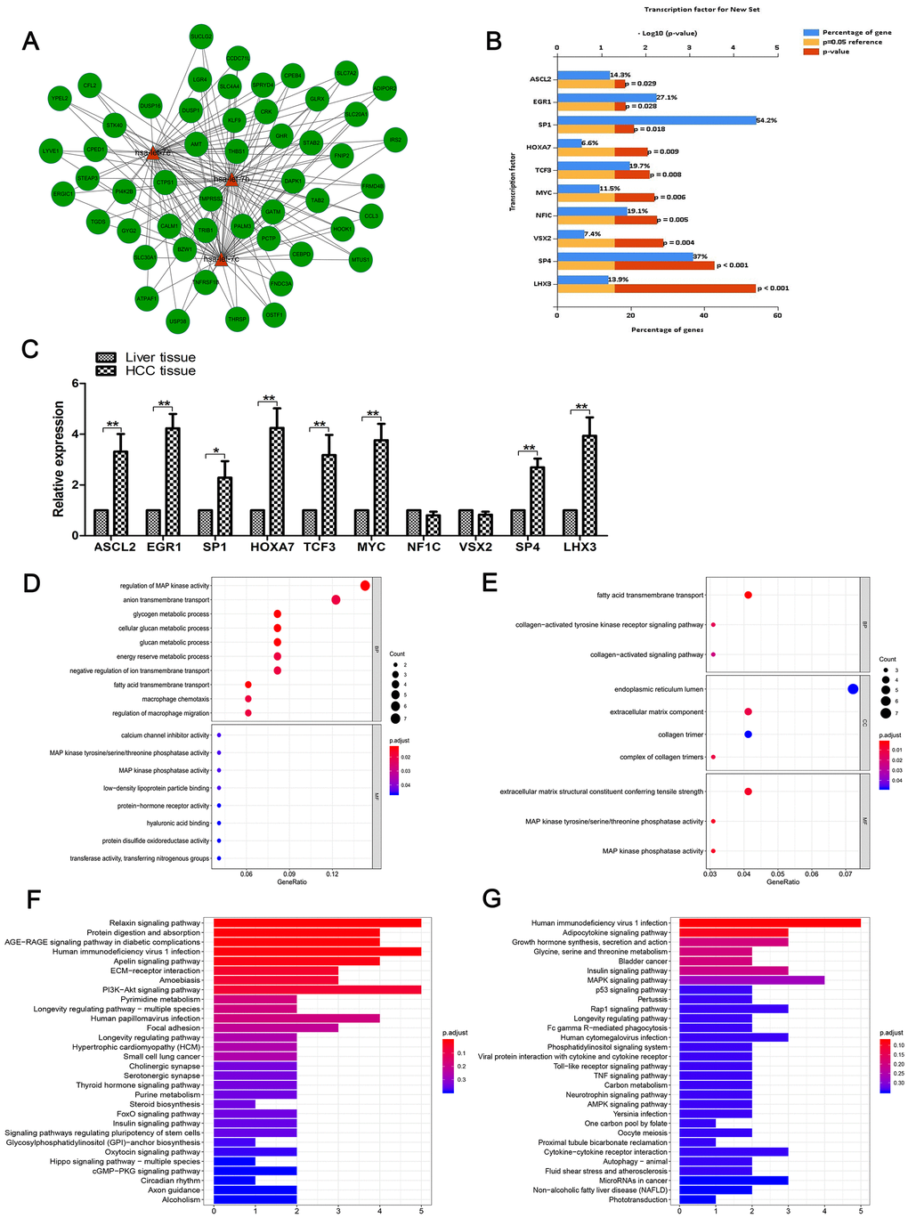 Using a functional-enrichment analysis tool (FunRich; http://www.funrich.org), we analyzed the most relevant neighboring and cross-linked target genes of the three miRNAs. The result was a network (Figure 2A), which was composed of these miRNAs and of 52 genes. Next, we analyzed the relevant transcription factors (TFs) of let-7b, let-7c and let-7e using FunRich. The top-10 relevant enriched TFs were Achaete–Scute family basic helix-loop-helix (BHLH) transcription factor 2 (ASCL2), early growth response 1 (EGR1), specificity protein 1 (SP1), homeobox A7 (HOXA7), transcription factor 3 (TCF3), myelocytomatosis oncogene (MYC), neurofibromin 1C (NF1C), visual system homeobox 2 (VSX2), SP4 and LIM homeobox 3 (LHX3) (Figure 2B). Then, we measured their expression levels in HCC specimens and matched non-tumor specimens using RT-qPCR. Results are shown in Figure 2C.