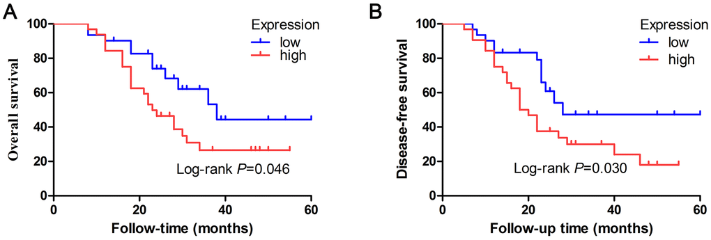 To explore whether expression of let-7e was associated with prognosis in HCC patients, we used KM survival analyses to compare the overall survival (OS) and disease-free survival (DFS) rates between the high- and low-expression groups. Results revealed that median OS was 23 months in the high–let-7e expression group versus 38 months in the low–let-7e expression group. The high–let-7e expression group had a significantly worse OS rate than the low–let-7e expression group (P=0.046, log-rank test; Figure 3A). The median DFS rates of patients with high and low let-7e expression were 19 and 28 months, respectively. Compared with the low–let-7e expression group, the high–let-7e expression group had a significantly worse DFS rate (P=0.030, log-rank test; Figure 3B). Therefore, high let-7e expression was significantly associated with poor prognosis in HCC patients.