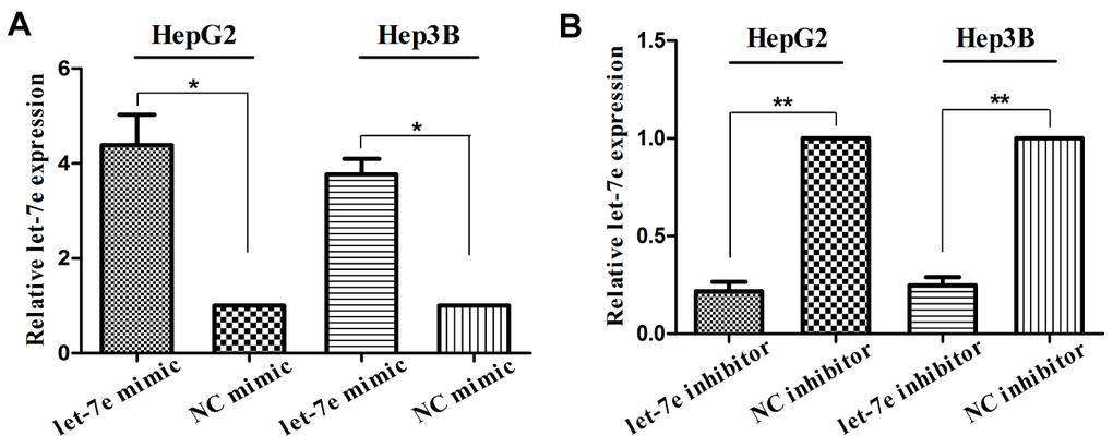 Expression of let-7e was significantly upregulated in HCC cells transfected with let-7e mimic than in those transfected with control mimic (Figure 4A). Conversely, let-7e expression was significantly downregulated in HCC cells transfected with let-7e inhibitor than in those transfected with control inhibitor (Figure 4B).