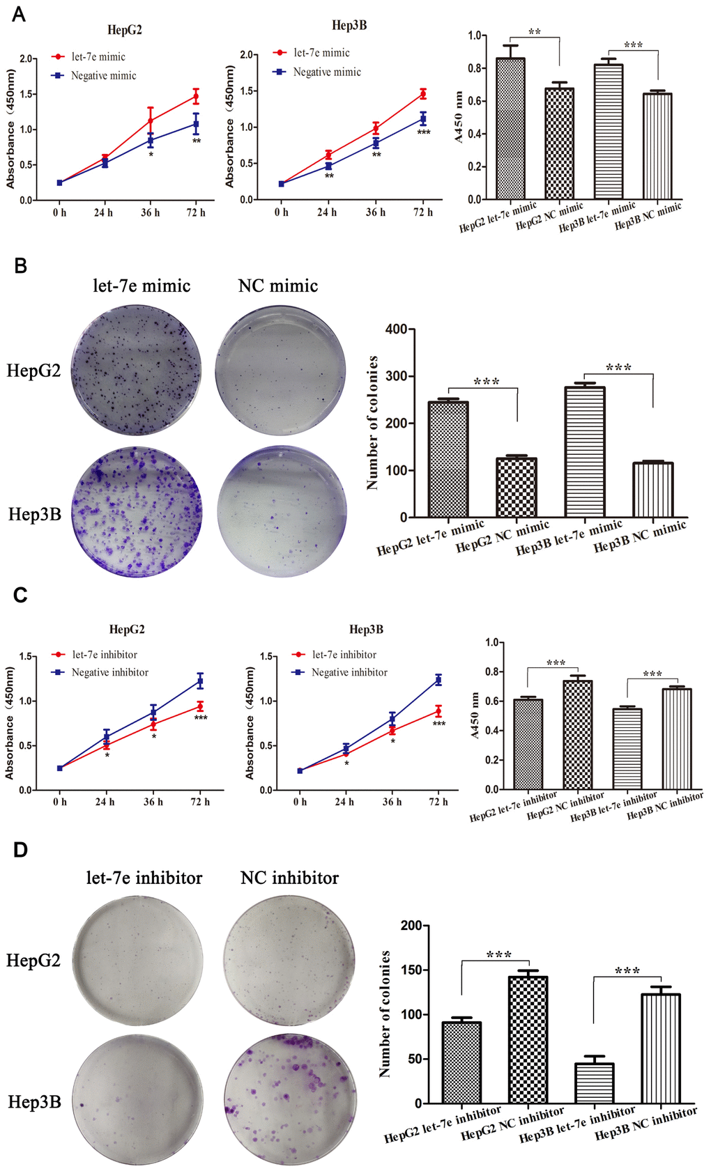 To explore whether high let-7e expression affected the growth of HCC cells, we performed cell viability and colony formation assays in HepG2 and Hep3B HCC cells. Cell viability assay results showed that upregulated let-7e promoted the proliferation of HCC cells (Figure 5A), while the colony formation assays revealed that upregulated let-7e improved the cells’ colony formation efficiency (Figure 5B). To prove whether downregulated let-7e could inhibit the growth of HCC cells, we transfected HepG2 and Hep3B HCC cells with let-7e inhibitor and NC inhibitor and then performed cell viability and colony formation assays. The results showed that downregulated let-7e inhibited cell proliferation of HCC cells in cell viability assays (Figure 5C). The colony formation assays showed that downregulated let-7e inhibited the colony formation efficiency of these cells (Figure 5D).