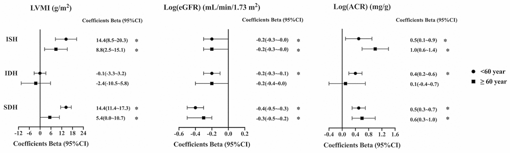 Compared with NM, ISH was significantly associated with lower eGFR in both younger and older patients (−0.2 log units and −0.2 log units, respectively, both P<0.05). SDH was also significantly associated with lower eGFR in both younger and older patients (−0.4 log units and −0.3 log units, respectively, both P<0.05). IDH was only negatively associated with eGFR among younger patients (−0.2 log units, P<0.05) (Figure 1).