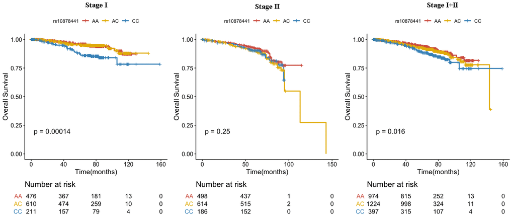 We combined the data from stage I and stage II, compared with rs10878441 AA genotype, CC genotype was significantly connected with poor prognosis in breast cancer (HR=1.69, 95% CI: 1.18-2.42, P=0.004), which were still significantly connected with breast cancer OS when adjusted for age at diagnosis, education, occupation, age at menarche, number of live births, breastfeeding duration, abortion, menopause, TNM stage, tumor size, histopathologic classification, grade, lymph node, ER, PR, and HER2 (HR=2.19, 95% CI: 1.30-3.70, P=0.003) (Table 5 and Figure 1). Furthermore, we evaluated the association between the SNP rs10878441 and breast cancer OS stratified by clinical characteristics (Supplementary Table 3). The association was significant for grade II breast cancer patients (HR=1.64, 95% CI: 1.11-2.40, P=0.012; adjusted HR=1.76, 95% CI: 1.08-2.88, P=0.022), and was significant for lymph node-negative breast cancer patients (HR=1.78, 95% CI: 1.16-2.74, P=0.008; adjusted HR=2.02, 95% CI: 1.07-2.36, P=0.029). Specifically, this SNP was associated with breast cancer patients older than 50 years (HR=1.58, 95% CI: 1.12-2.24, P=0.010; adjusted HR=2.03, 95% CI: 1.21-3.42, P=0.008) (Supplementary Table 3).